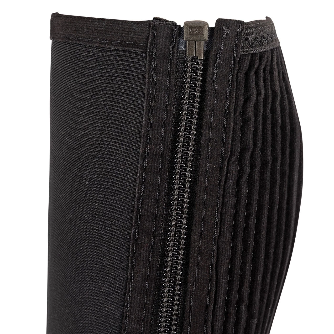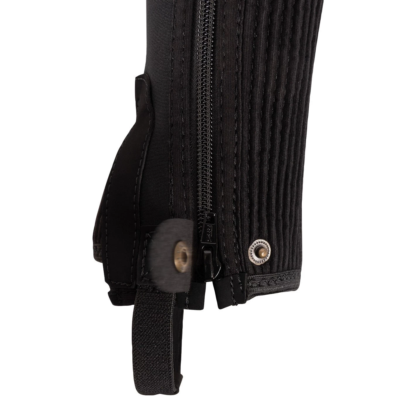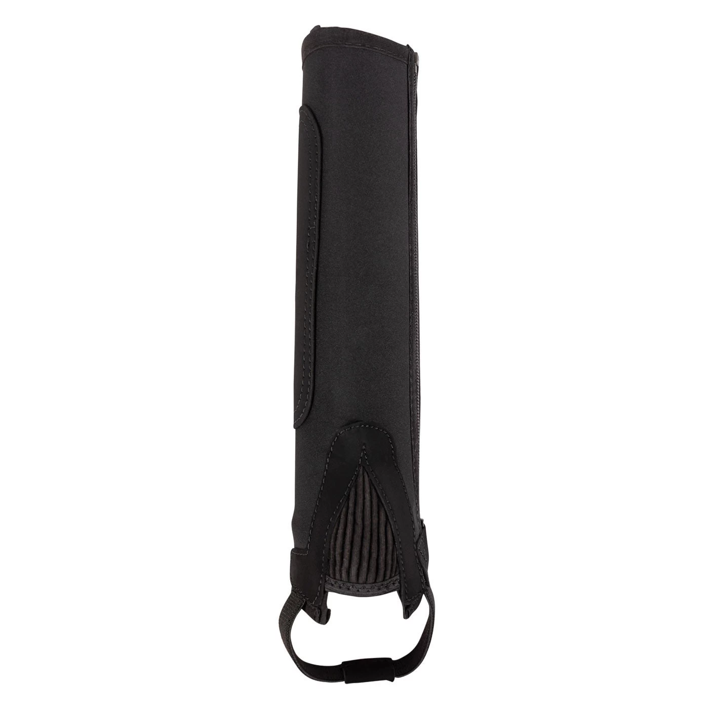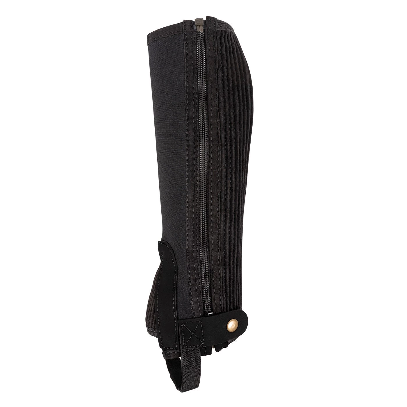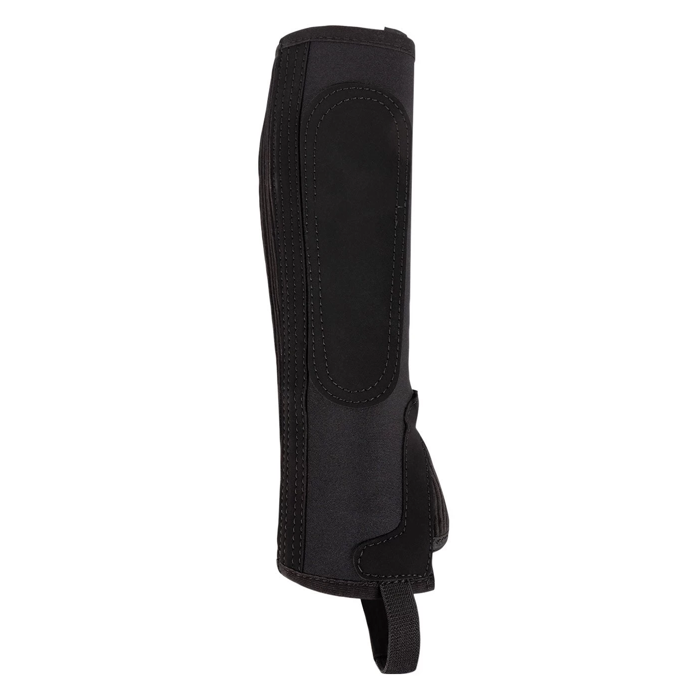 Traditional black half chap with neoprene construction allows for optimal comfort in the saddle. Soft stretch materials contour to the curve of your leg for superior fit. Stress point reinforcements and a padded inner calf enhance durability and grip. Complete with a side zipper and snap.