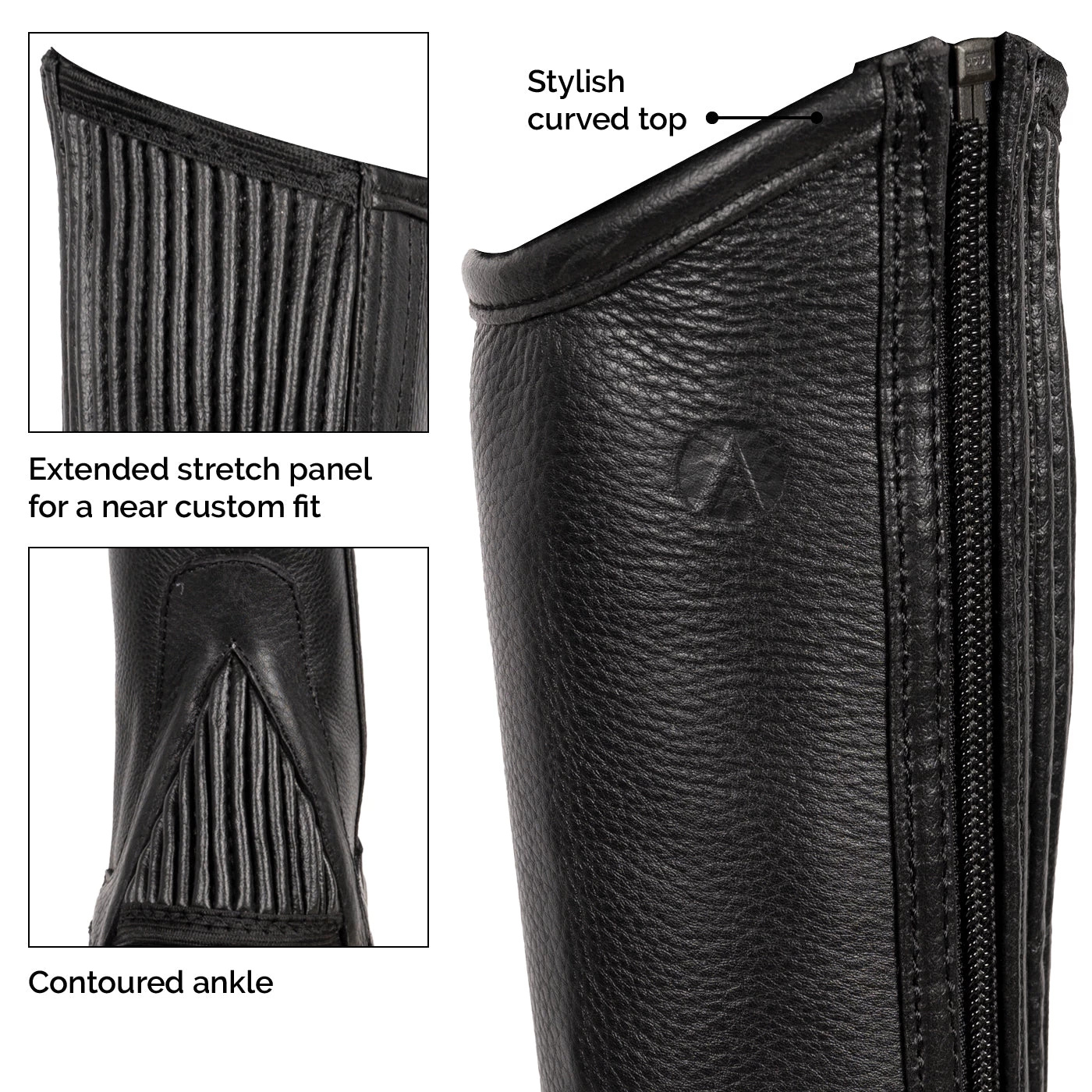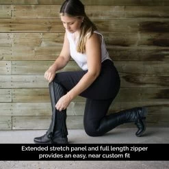 Auken’s FitMe™ Collection is designed to fit all widths for an inclusive, and comfortable design. The Aspire Half Chap is suitable for everyday wear or the competition ring with a genuine leather construction. Complete with a full-zip design and snap closure for easy on and off with an elasticized front for added comfort. Unisex sizing.