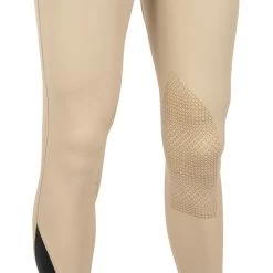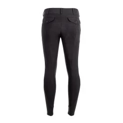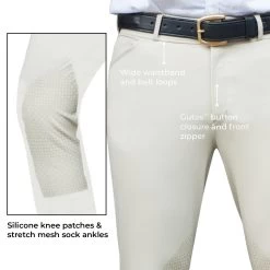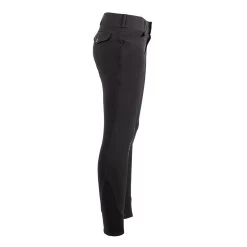 Lightweight yet structured breech for men offers traditional styling suitable for either showing or schooling. Two front pockets conveniently keep valuables close while two faux back pockets with button closures add a charming touch. Stretchy panels at the ankle help eliminate bulk under breeches and durable silicone knee patches enhance in-saddle grip. Complete with belt loops for a finished, professional appearance. 89% Nylon, 11% Spandex.