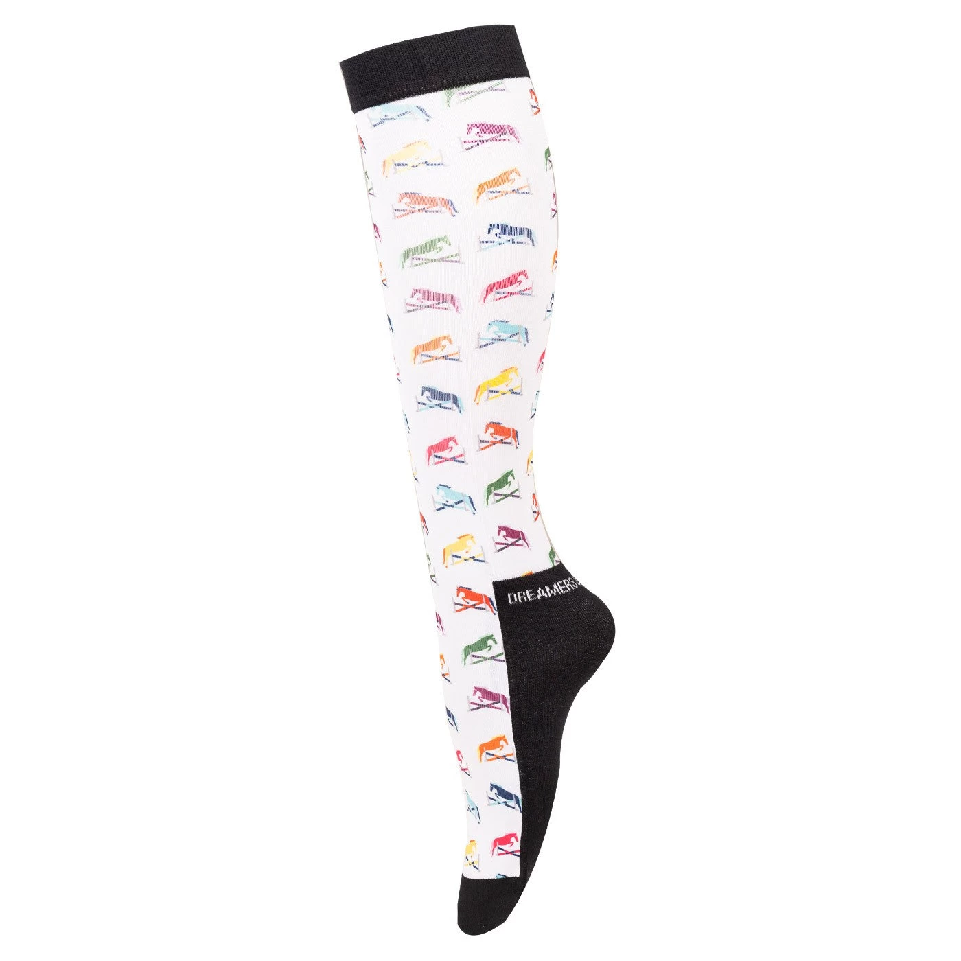 Perfect for schooling or at the show, Dreamers & Schemers boot socks are suitable for use under tall boots and feature a breathable construction with a thinly padded cotton terry footbed for all day comfort. The inclusion of a flat seam toe helps to eliminate rubbing and the padded footbed carries up the back of the sock to help protect your heel. Complete with a multi-coloured jumping horse design.