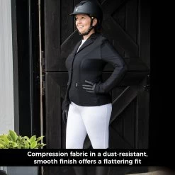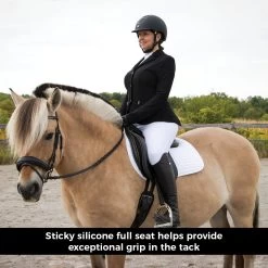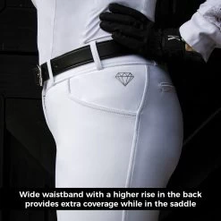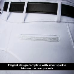 Exclusive to Greenhawk, the Elation Diamond London Breech is an elegantly styled breech featuring silver metallic trim on the rear pockets. Dust resistant with a smooth finish and higher waistband at the back make for a secure fit while in the show ring.