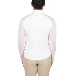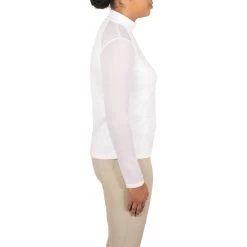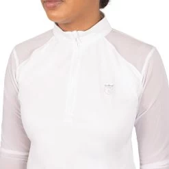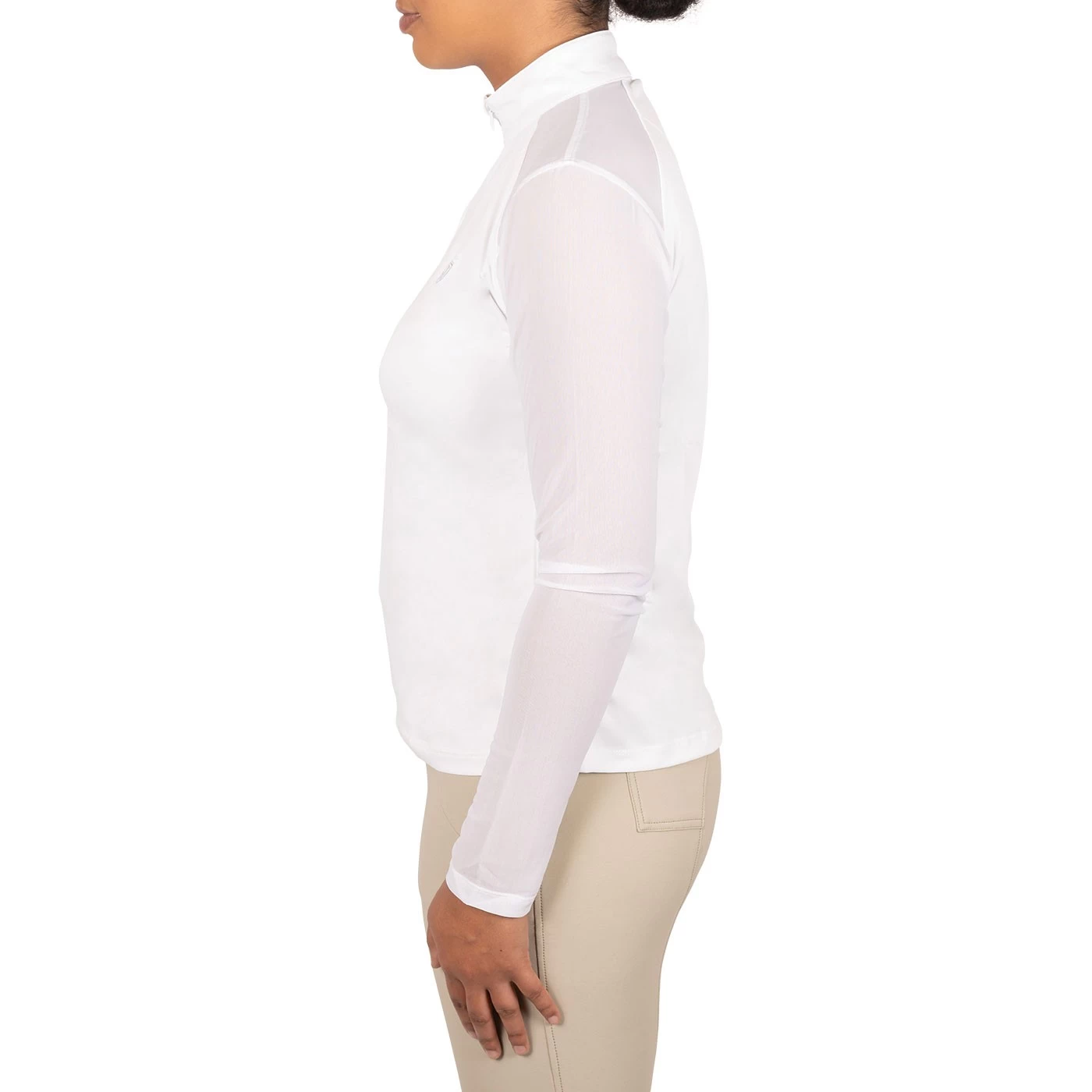 The Elation Platinum Amalfi Long Sleeve Show Shirt helps to keep you cool while competing with EquiCool fabric and mesh long sleeves for added breathability. Complete with an embroidered logo on the chest, a zippered front, and neck guard.
