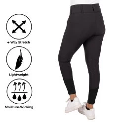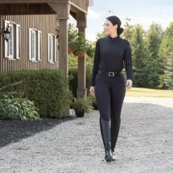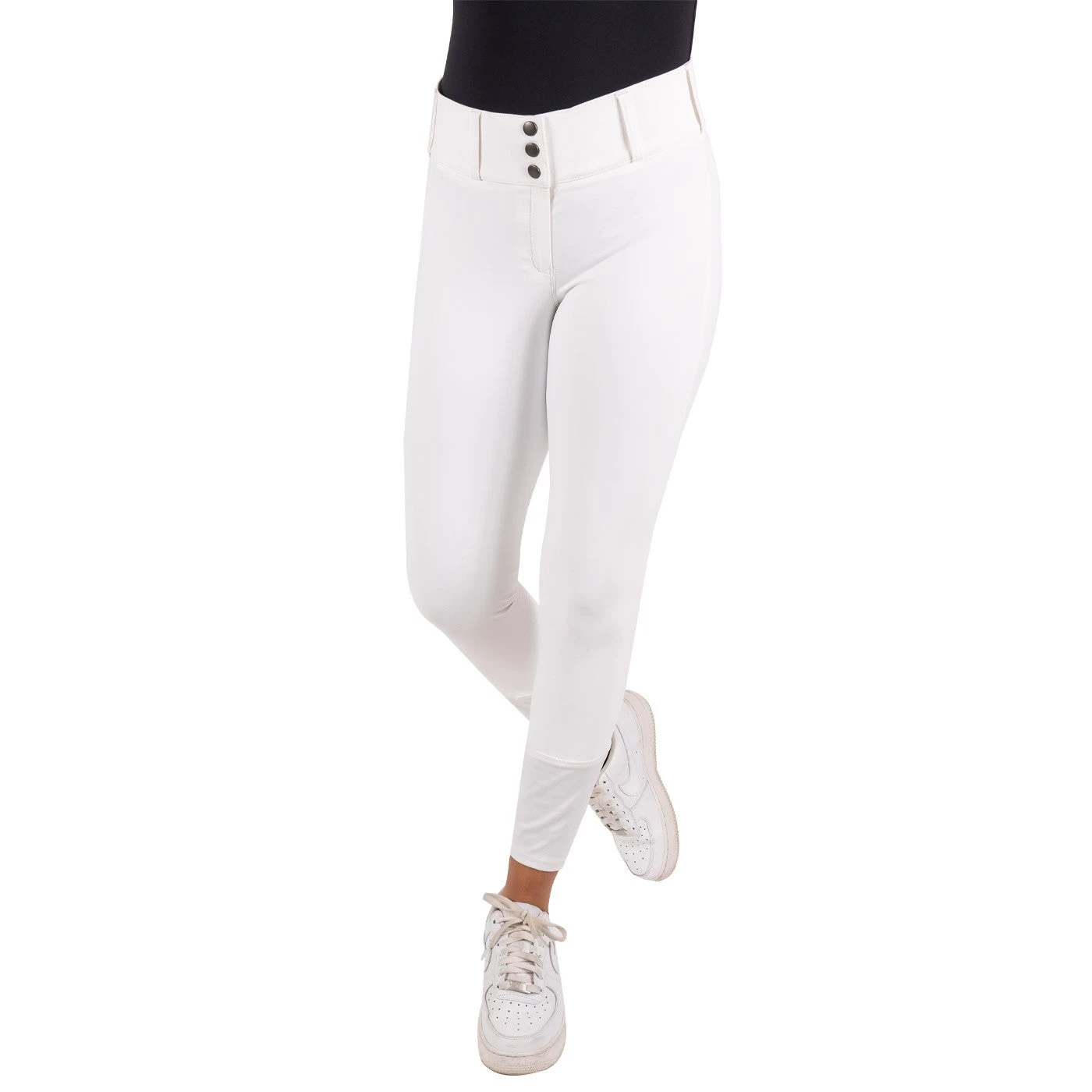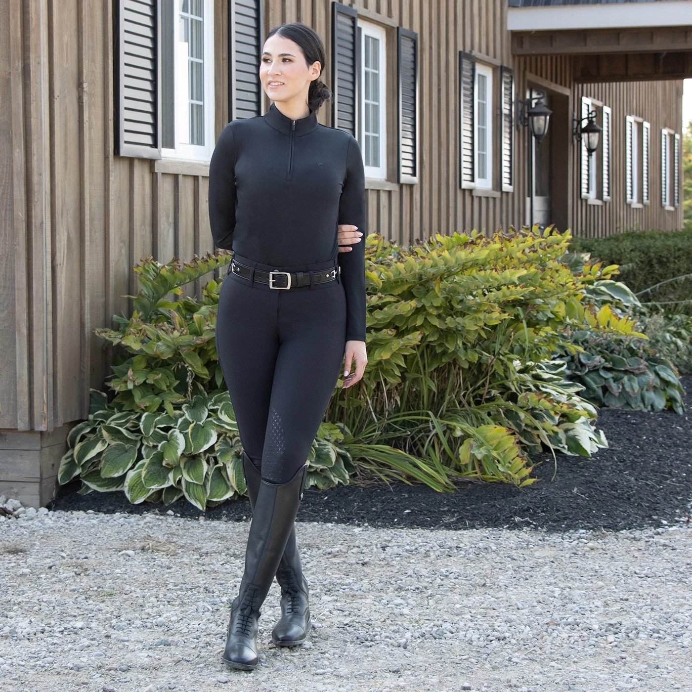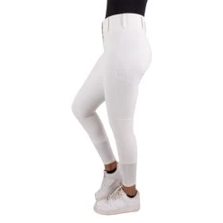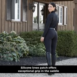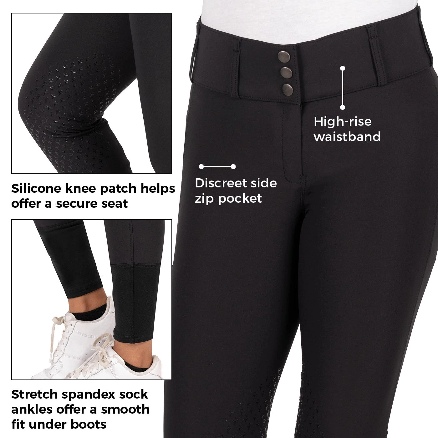 The Elation Platinum Ellis Breech offers comfort and technical performance for everyday schooling. Constructed from nylon microfibre and spandex for superior stretch and shape recovery. Features UV protection, and silicone grip knee patches for added grip in the saddle. Complete with a high waist design, 3 snap closures, a zippered thigh pocket, and elasticized socks for a smooth fit under tall boots.