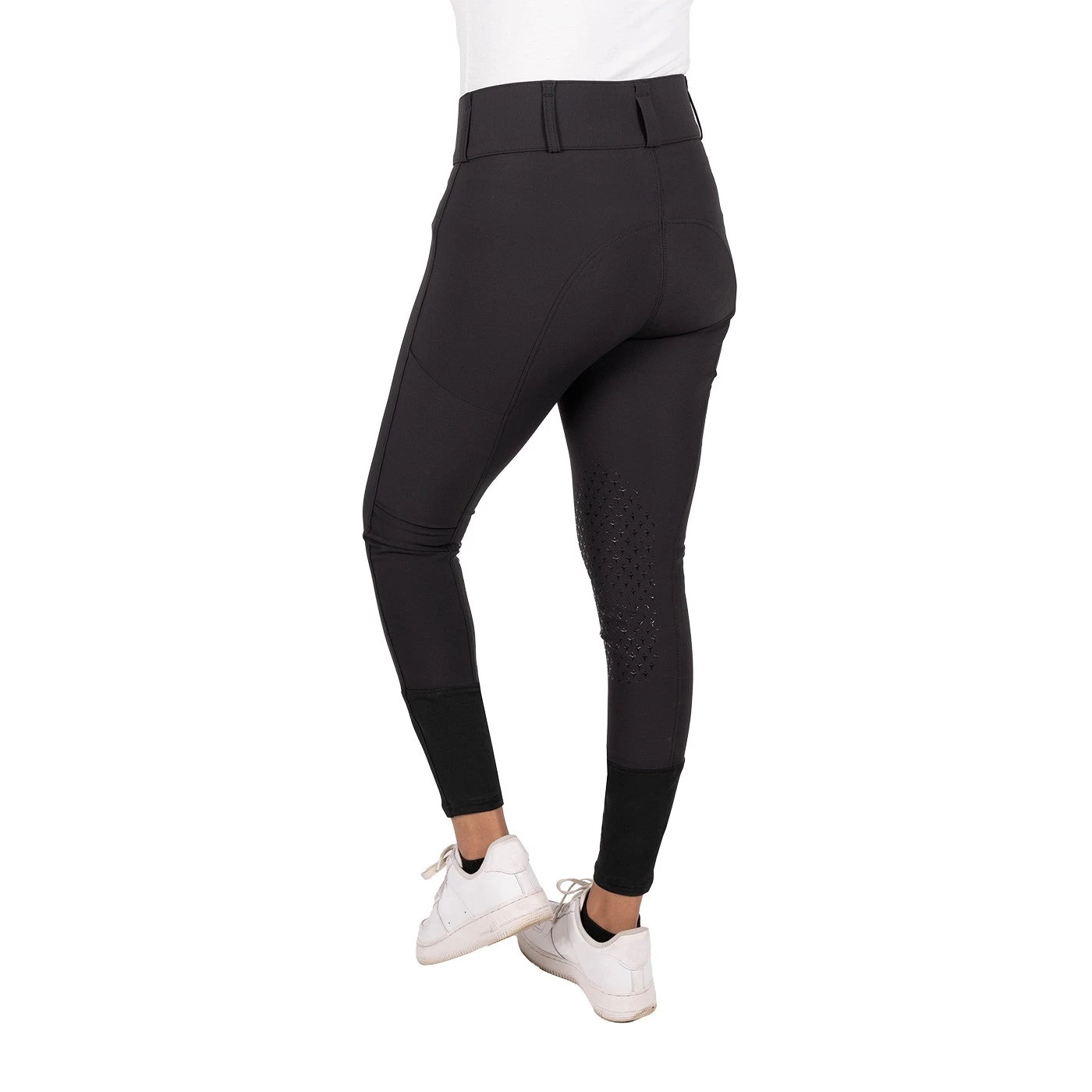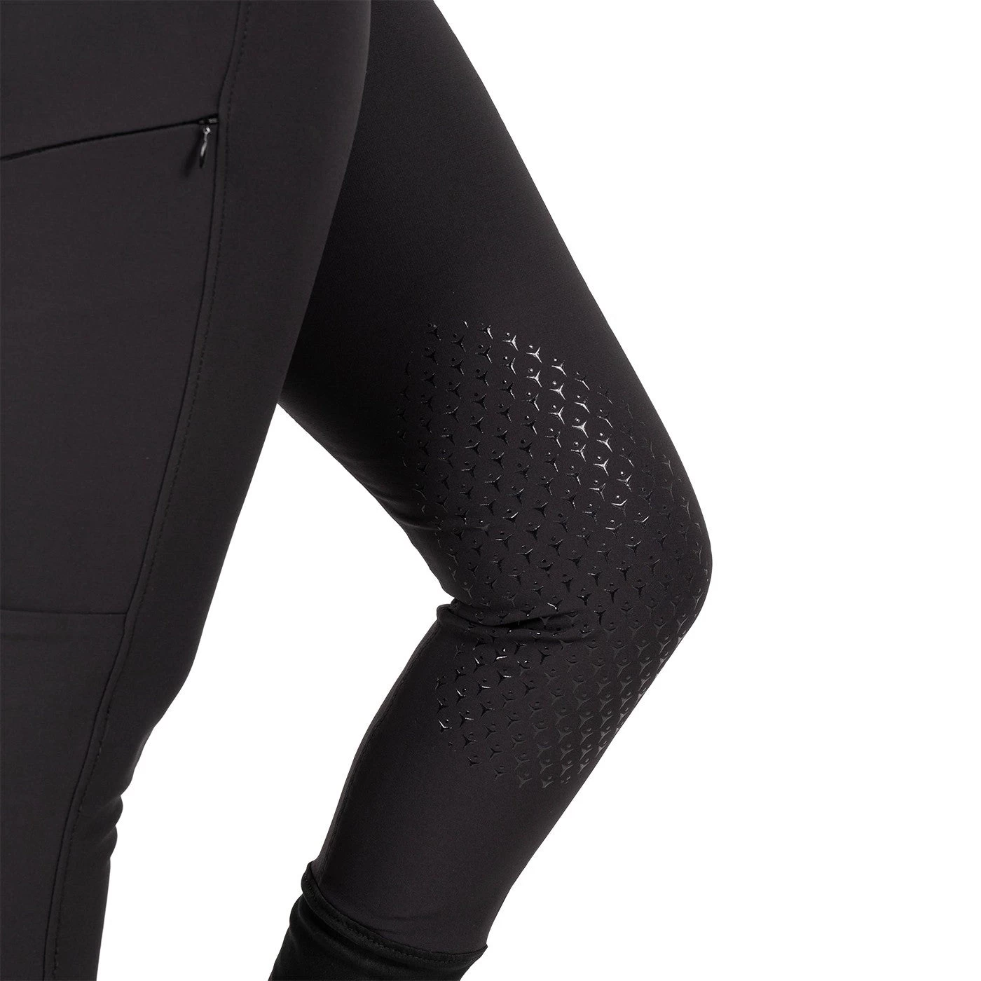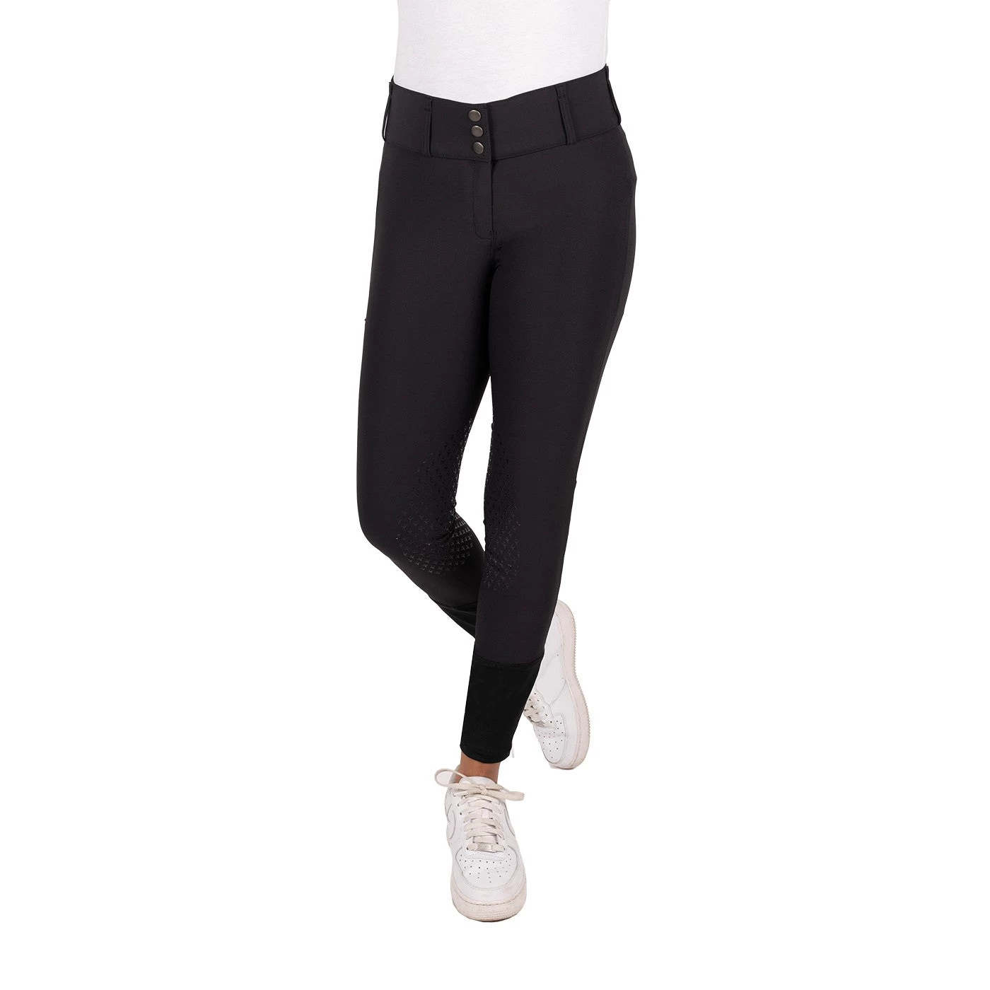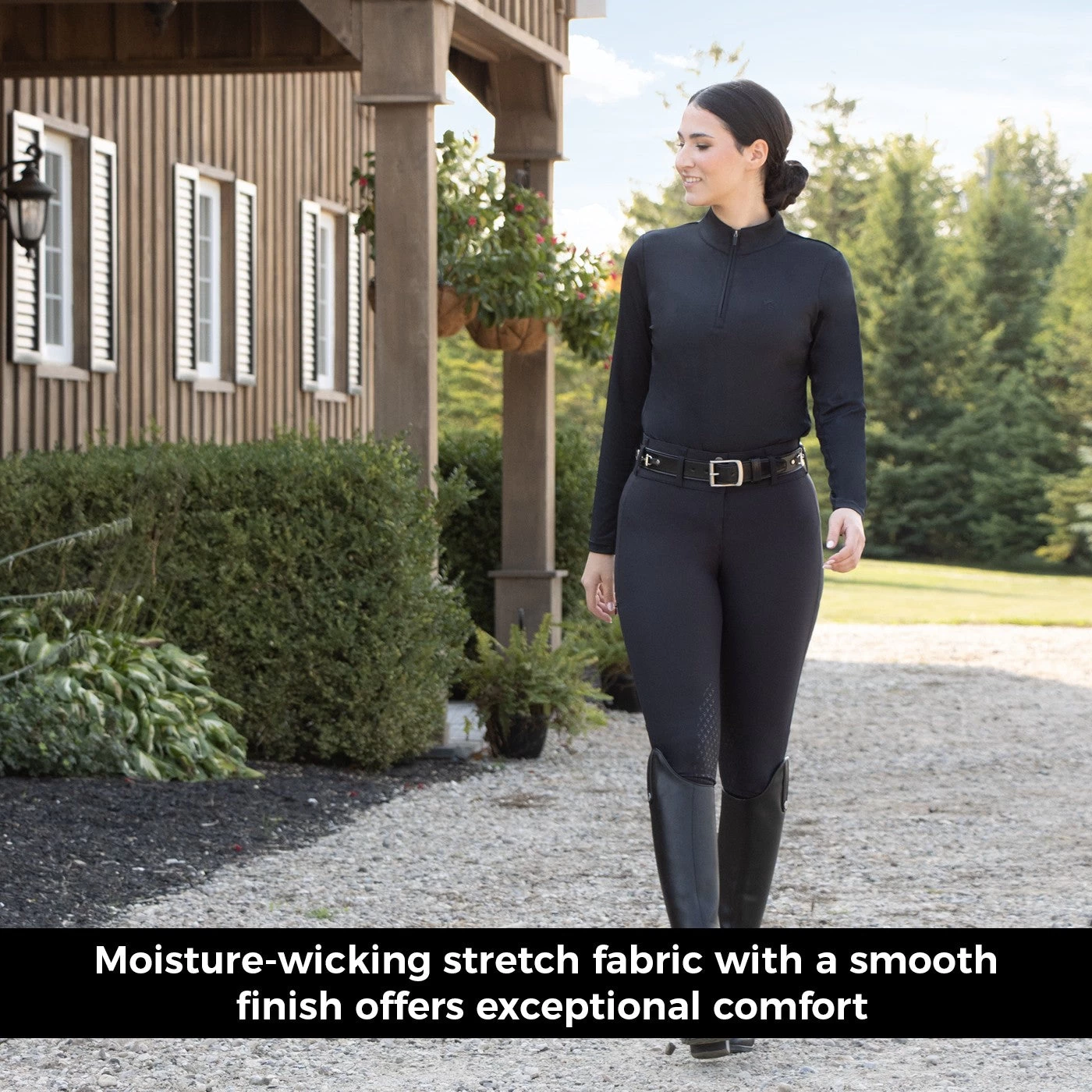 The Elation Platinum Ellis Breech offers comfort and technical performance for everyday schooling. Constructed from nylon microfibre and spandex for superior stretch and shape recovery. Features UV protection, and silicone grip knee patches for added grip in the saddle. Complete with a high waist design, 3 snap closures, a zippered thigh pocket, and elasticized socks for a smooth fit under tall boots.