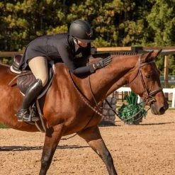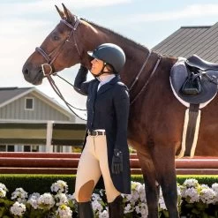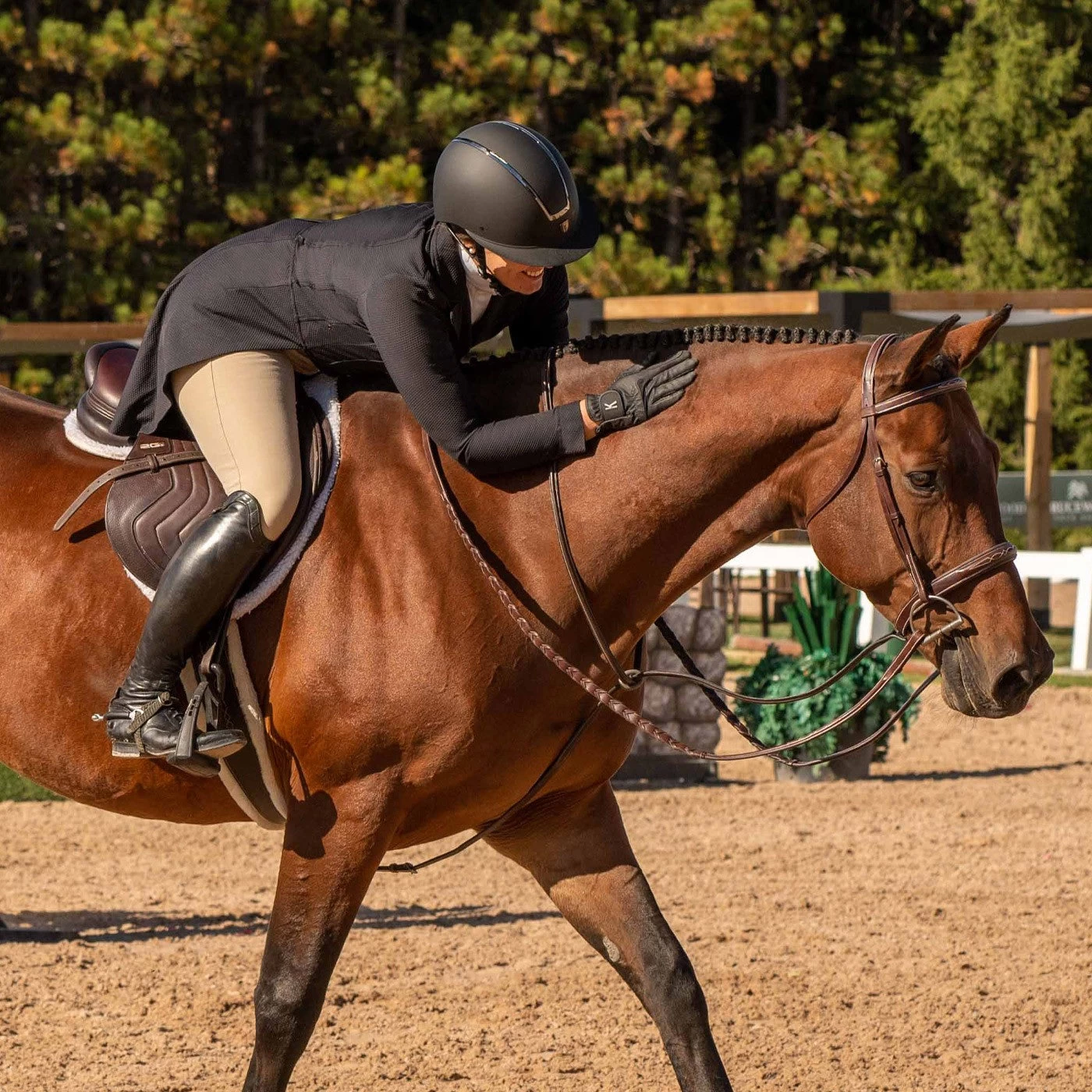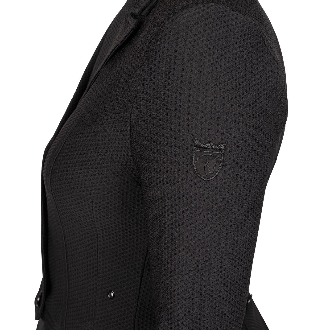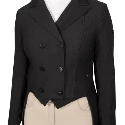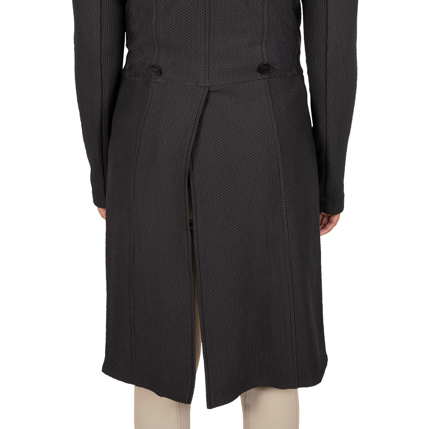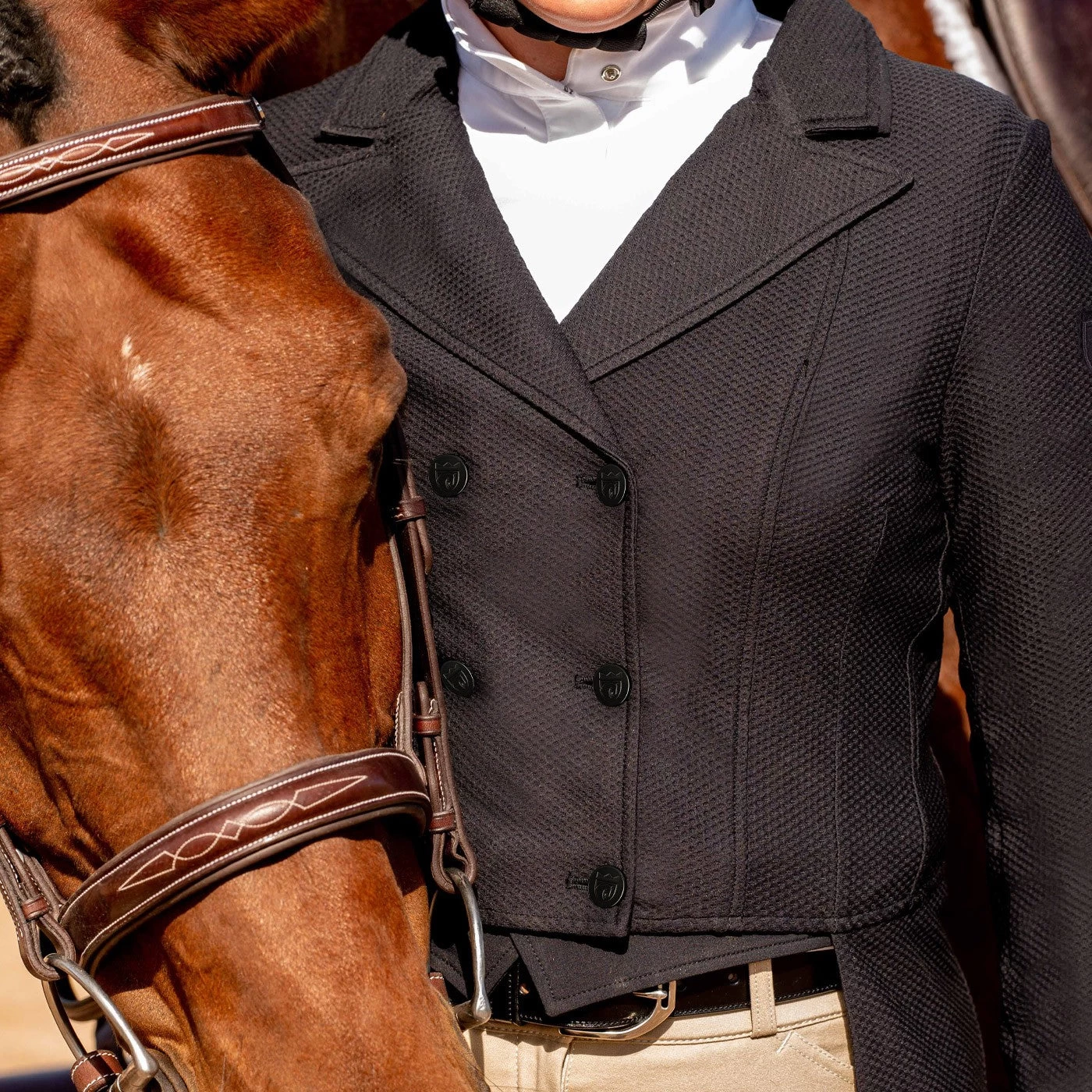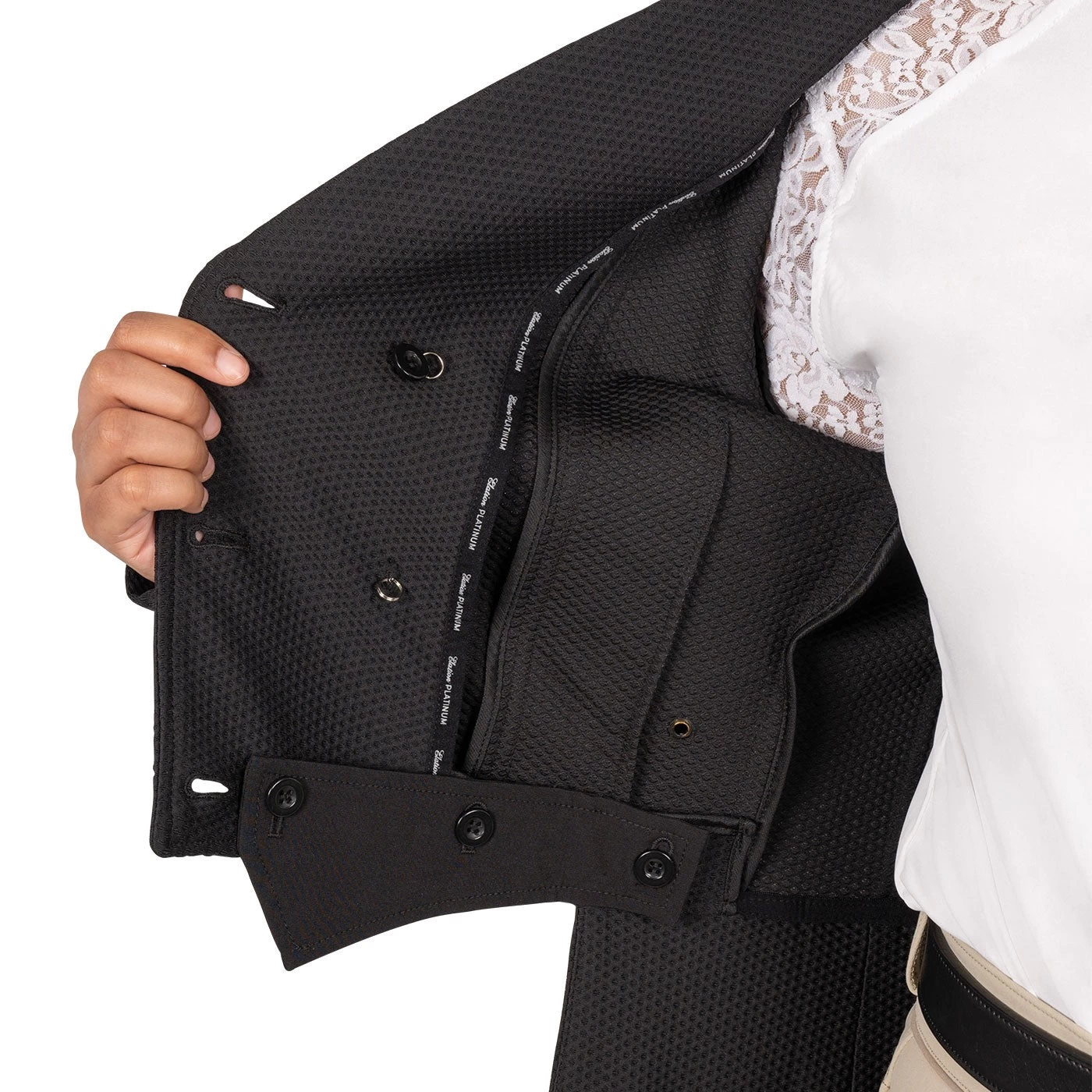 The Elation Platinum Tosca Shadbelly Show Coat combines function and style, suitable for the competition ring. Constructed with a mesh design, the Tosca Shadbelly offers 4-way stretch and breathability for added comfort on the warmest of days. Features princess seams on the front and back for a flattering fit, and traditional double breasted button closures with removeable points. Machine washable for easy convenience between shows.