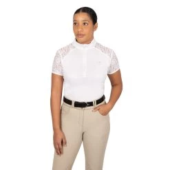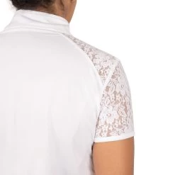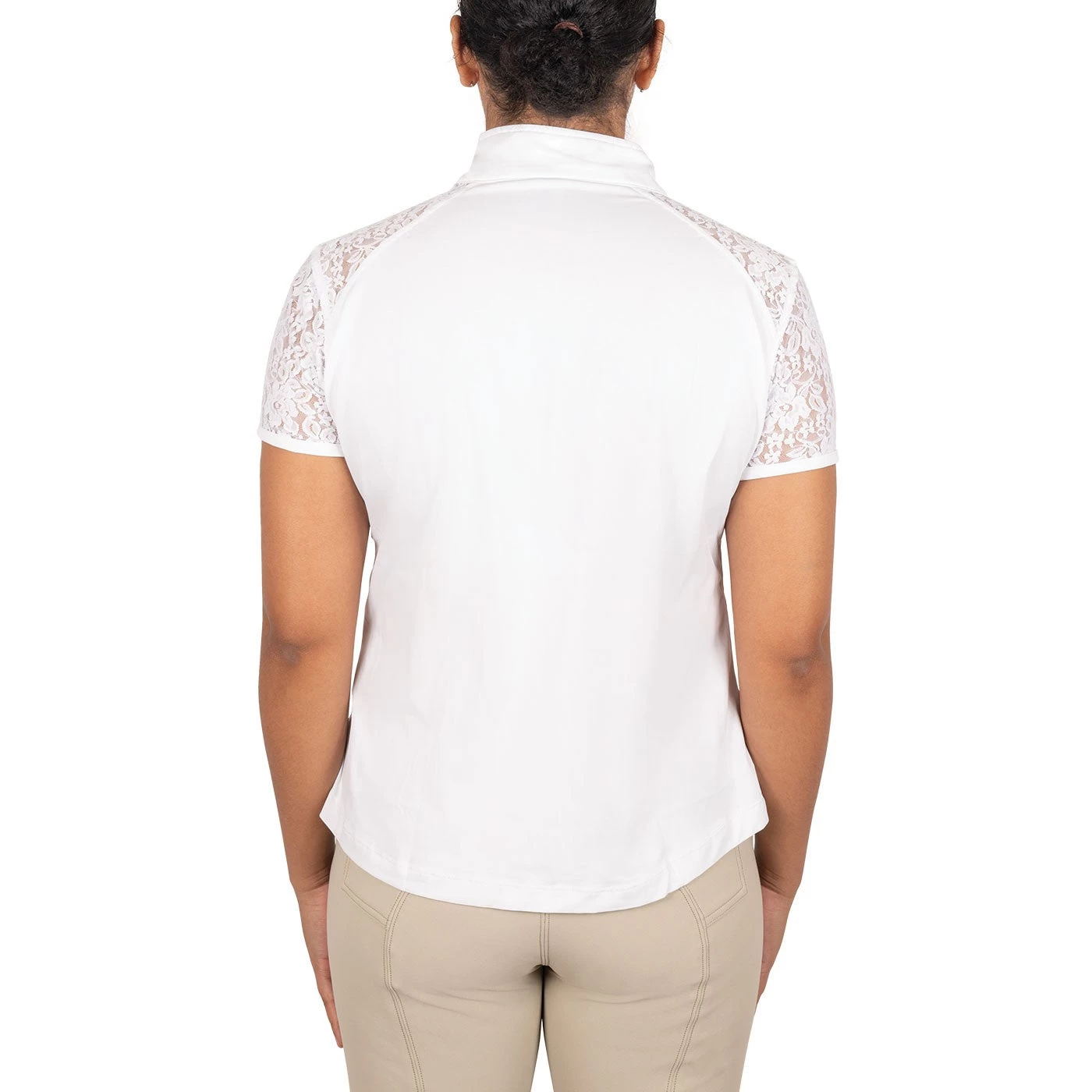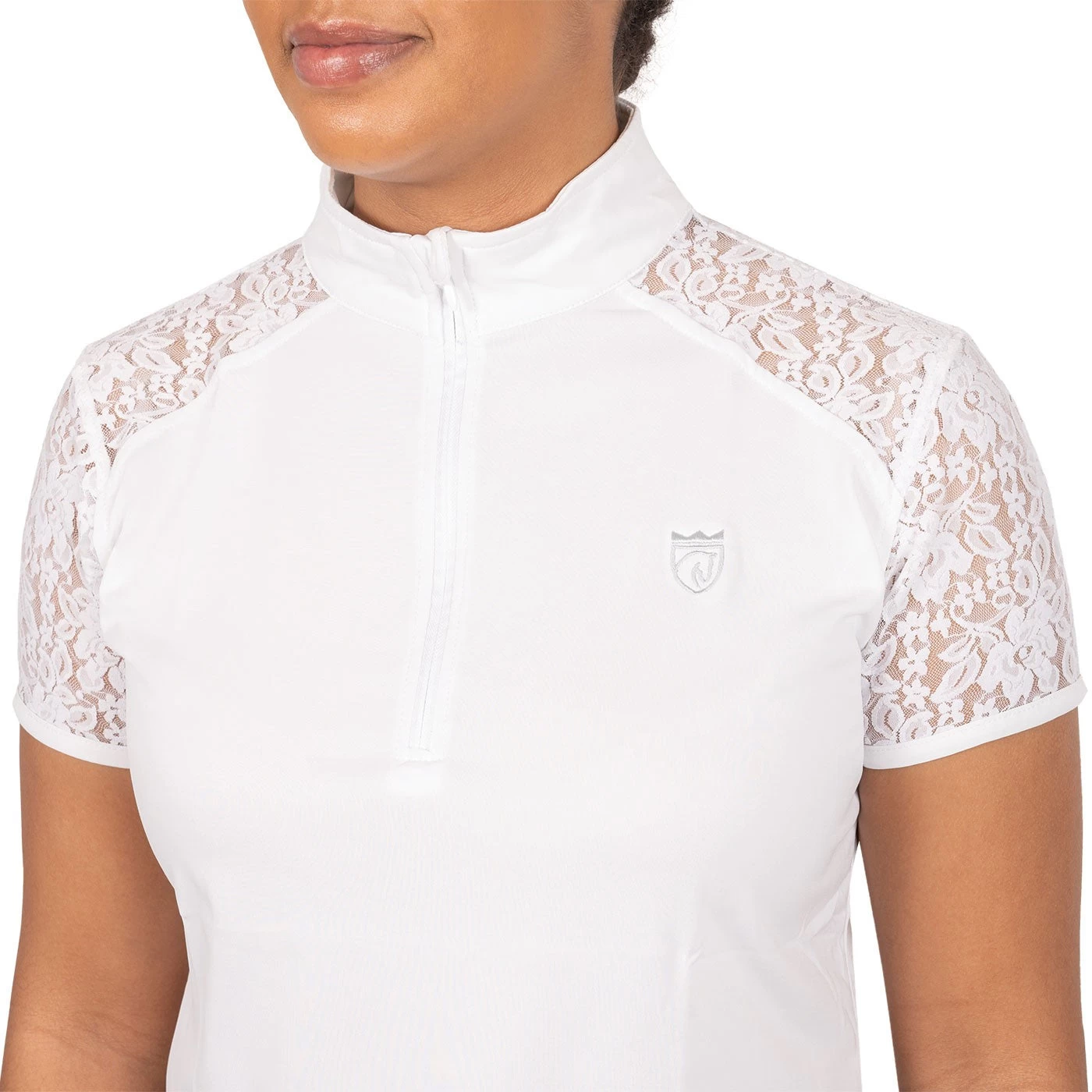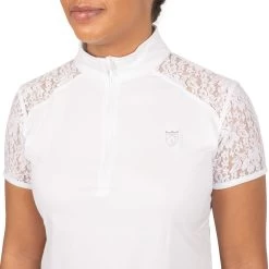 The Elation Platinum Turin Short Sleeve Show Shirt offers a technical option suitable for the competition ring. Features lace detailing for a feminine touch while offering practical cooling. Complete with a concealed quarter zip, and an embroidered logo on the chest.