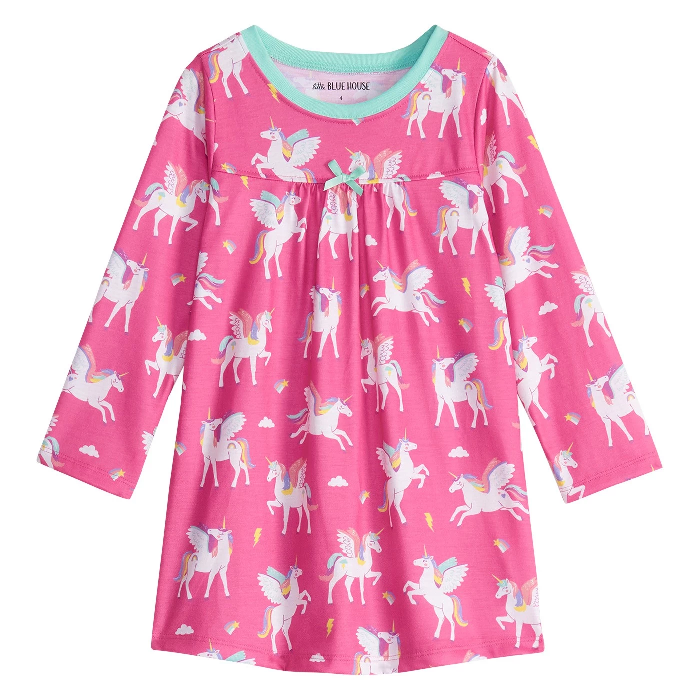 The Hatley Rainbow Pegasus Nightdress features an all-over rainbow Pegasus print with teal trims, an empire waistline and a satin bow at the front.