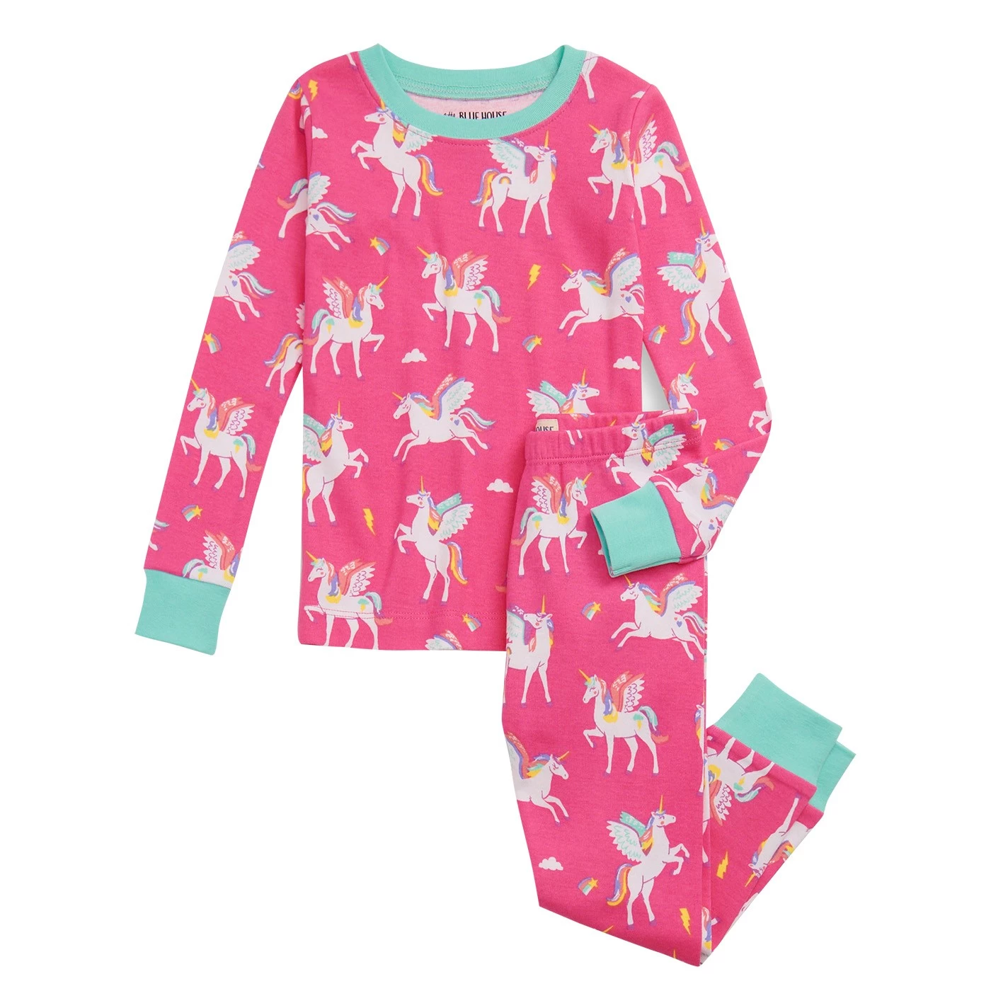 The Hatley Rainbow Pegasus Pajama Set is made from 100% cotton with a snug-fitting construction. Features a rainbow Pegasus print with contrast cuffs and an elastic waistband.