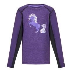 The Kerrits Free Frolic Base Layer Top features a sassy steed with a swirling mane and tail in a delicately soft, stretchy fabric. Constructed with Kwikwarm™ technology using volcanic ash in the fabric that stores heat from the body to keep kids warm while naturally deodorizing. Perfect for layering or wearing alone!