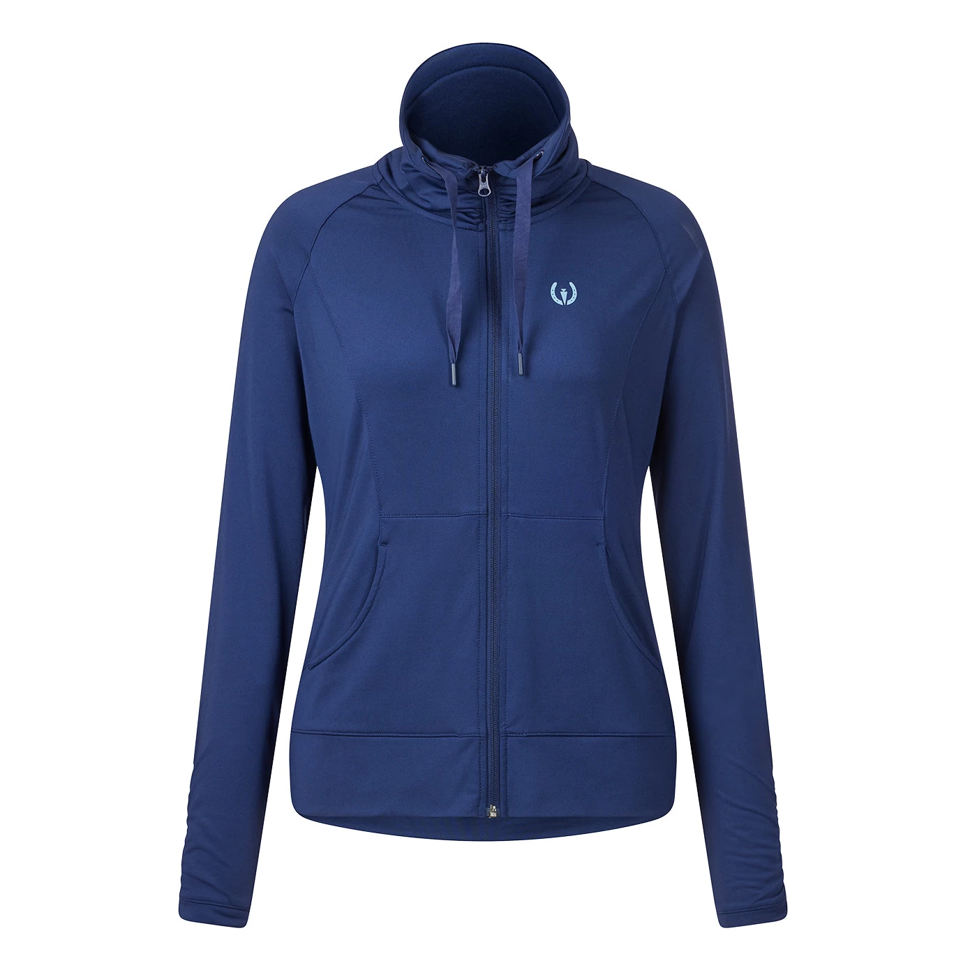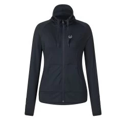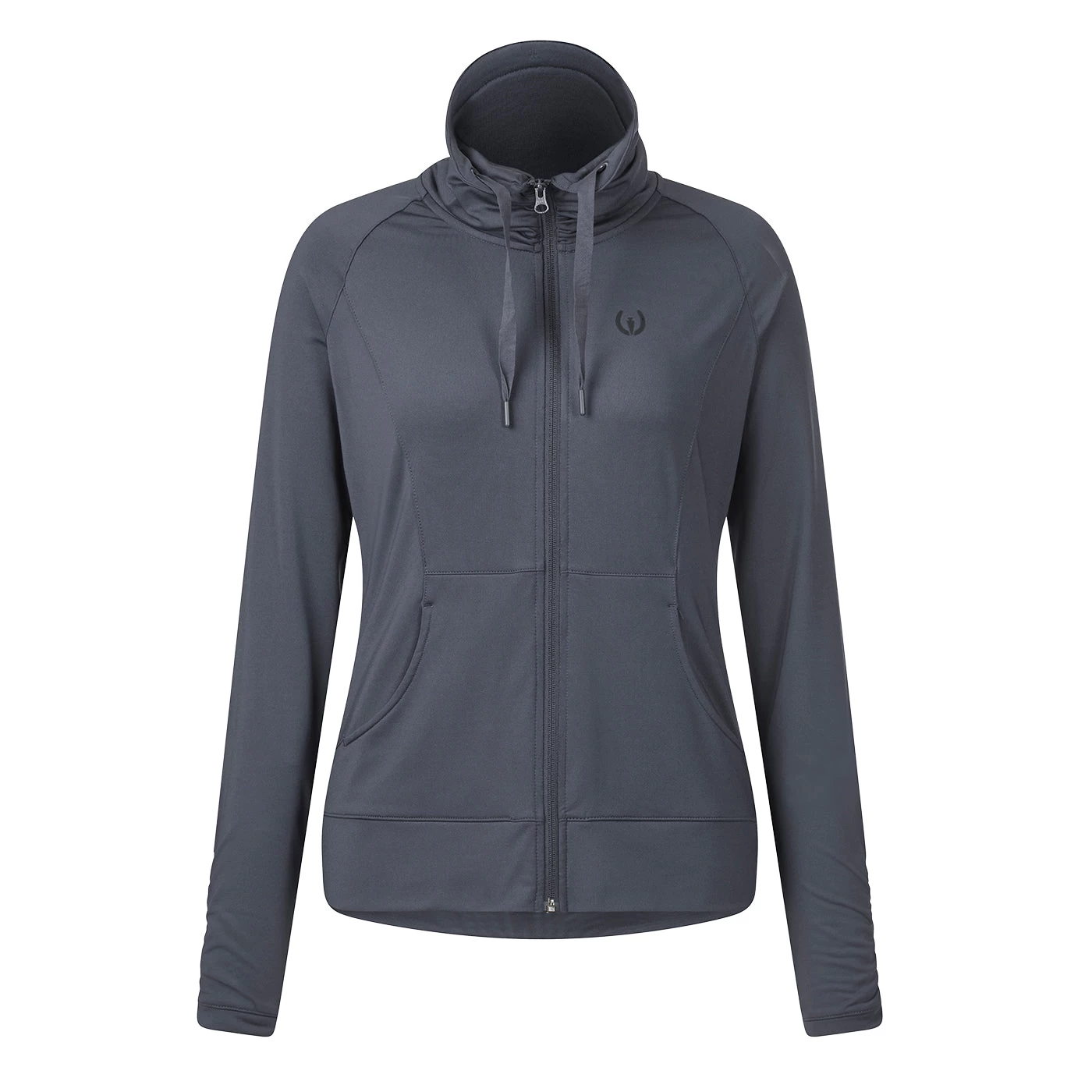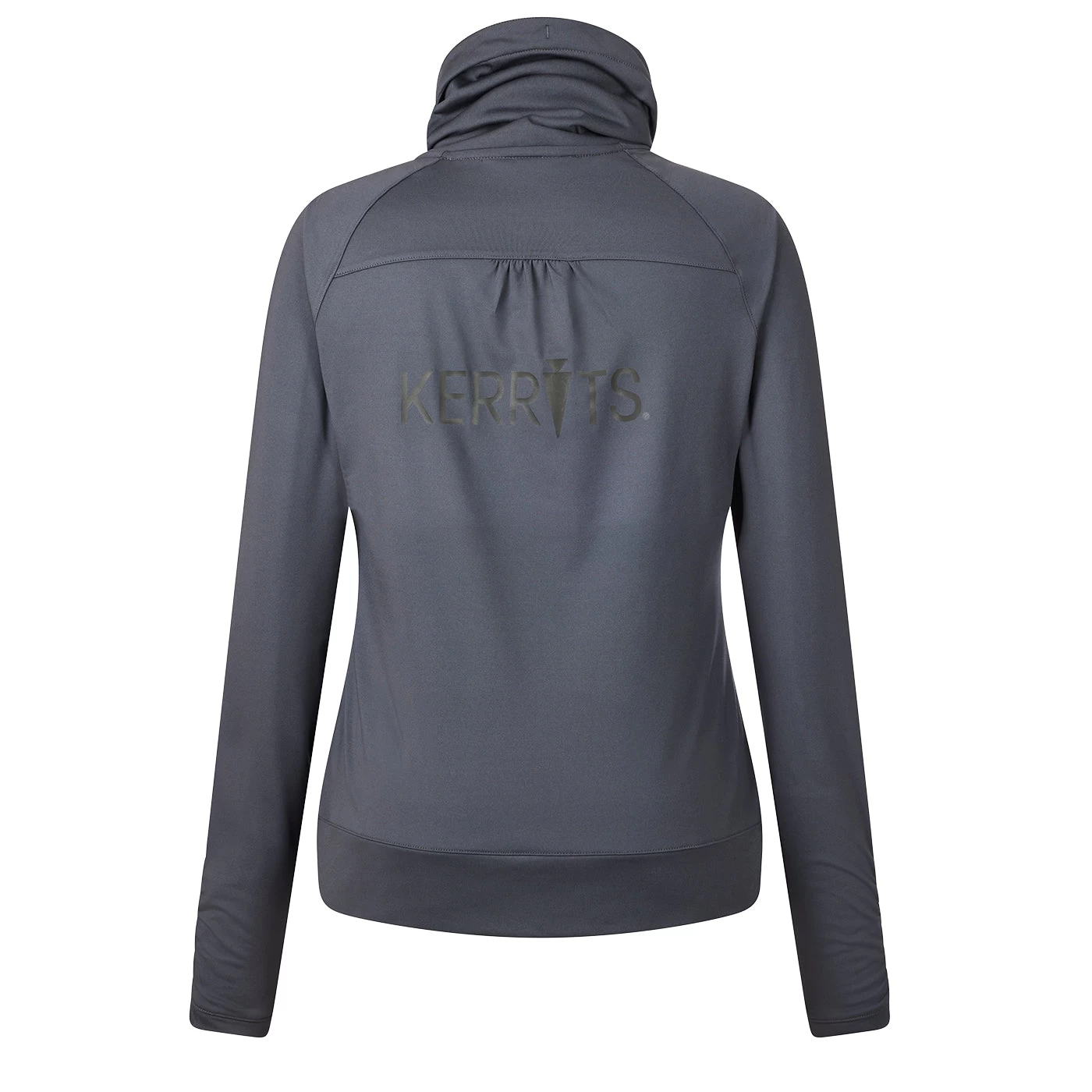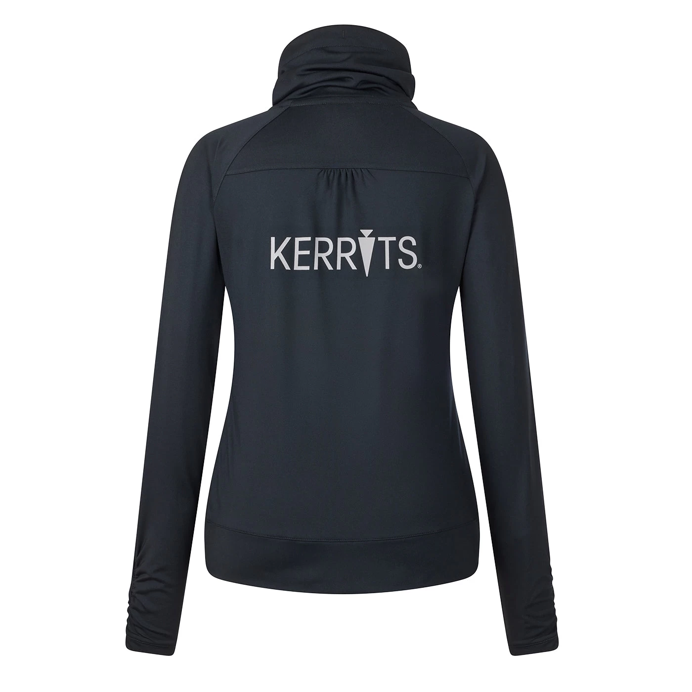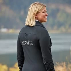 Online exclusive! Sporty and stylish, this full zip jacket features a tall collar, front pockets, and feminine, ruched details at the neck and back seam. Kerrits brand logo is screened on center back, with a smaller Kerrits horseshoe logo on front chest. Stretchy and comfortable with a smooth exterior, perfect to layer over a tee or to help keep show shirts clean.