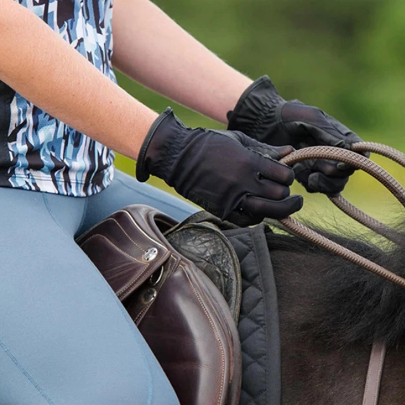 These riding gloves are designed with one side that ventilates and one side that grips. This combination of materials allows for a glove that breathes and stretches with unrestricted movement while riding or working. Complete with Griptek palm for precision rein handling and pull-on style for easy on and off.