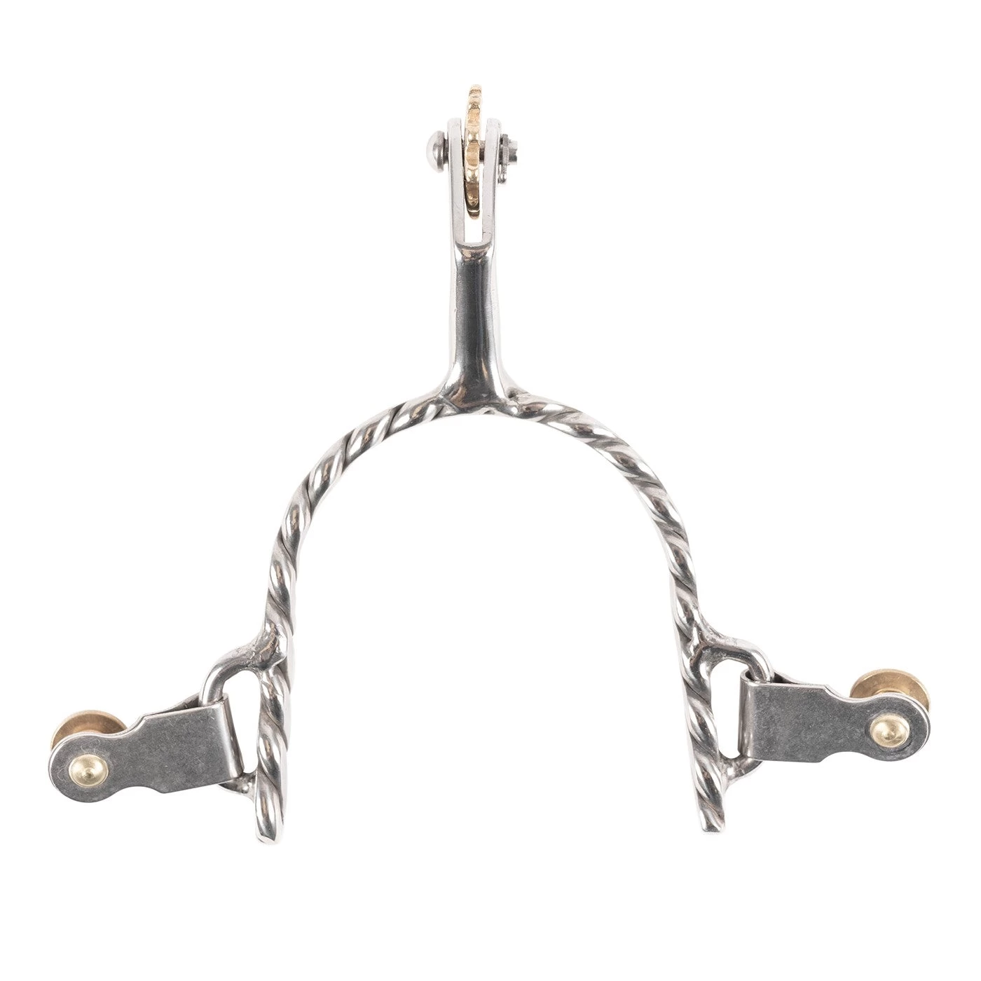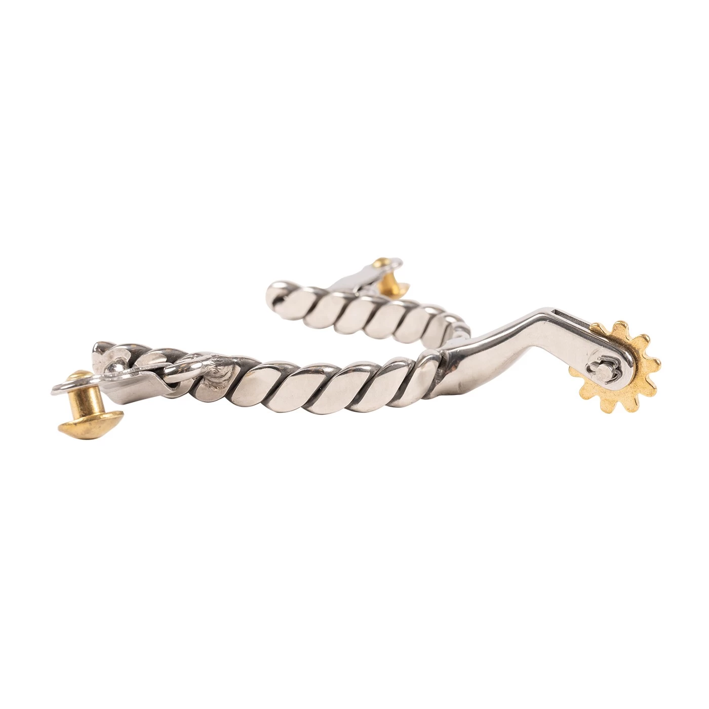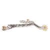 Sized for women’s boots, the Metalab Twisted Stainless Steel Western Spurs feature an eye catching, detailed 1/2″ heel band. These spurs are complete with a ten point rowel mounted on a 1 3/4″ shank. Rowel and buttons have a beautiful contrasting brass-coloured finish. Sold as a pair. Spur straps sold separately.