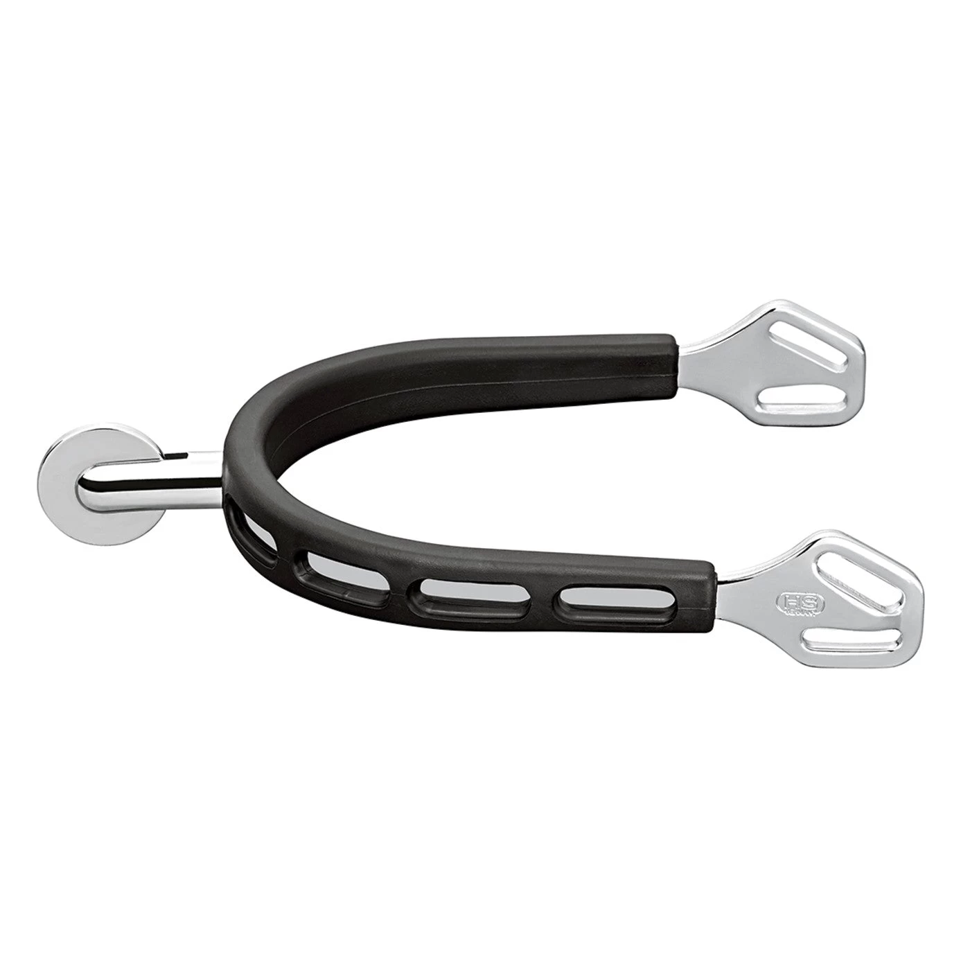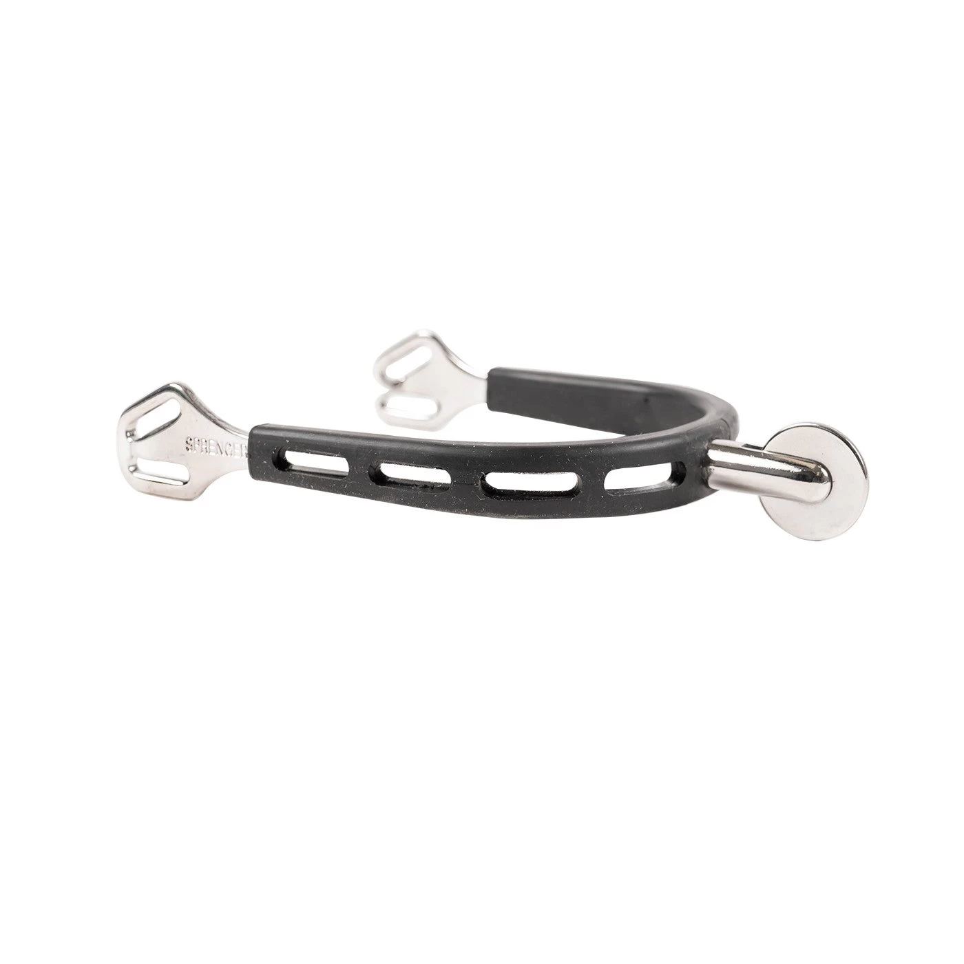 Superior design fits perfectly over riding boots, eliminating pressure points while offering stability for correct spur placement. Rubber covering over the stainless steel further secures the spur in place for enhanced performance and is less abrasive to boot leather.