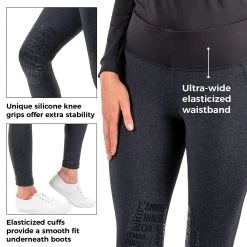 Perfect for summer riding or layering in colder weather, these super stretchy sport riding tight offers maximum breathability, mobility and comfort. Ultra-wide, elasticized waistband offers flattering tummy-control and comfortable support and elasticized cuffs enhance fit in boots or half chaps. A unique silicone knee grip offers extra stability in the saddle and a large thigh pocket that fits most cell phones. Conveniently machine washable. 42% Polyamide, 35% Polyester, 23% Elastane. Available exclusively at Greenhawk.