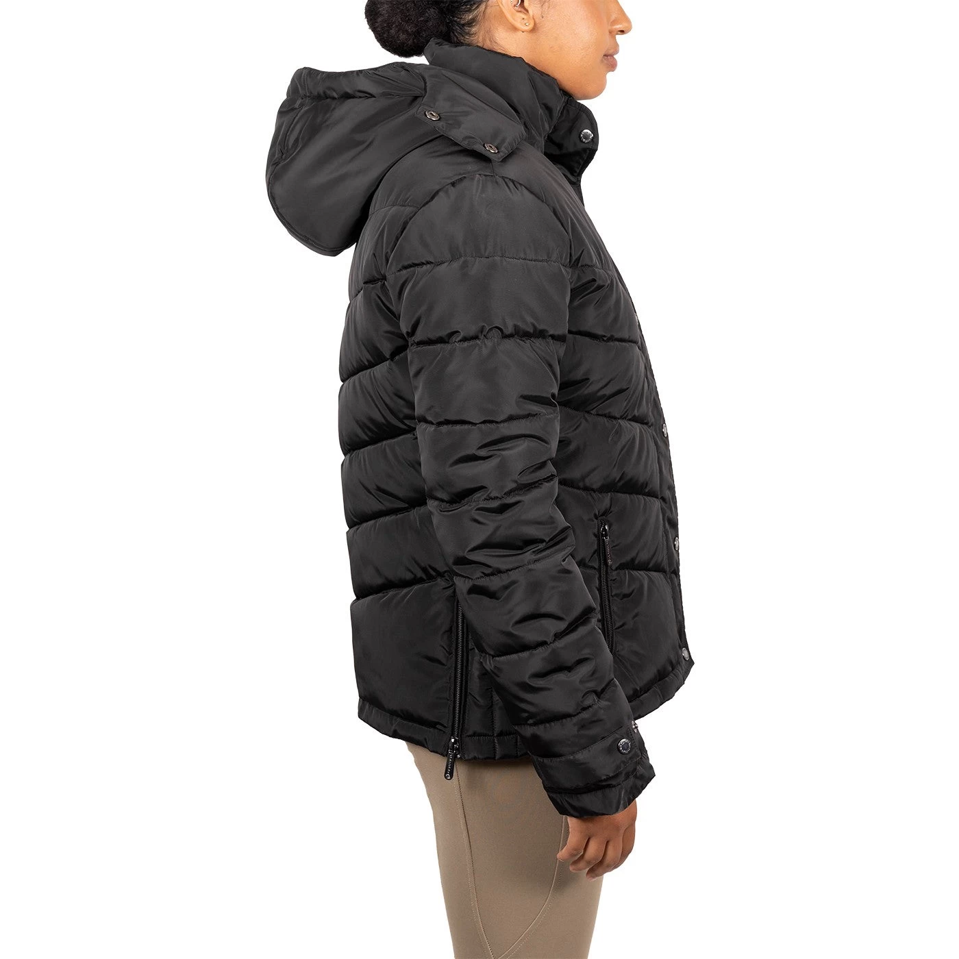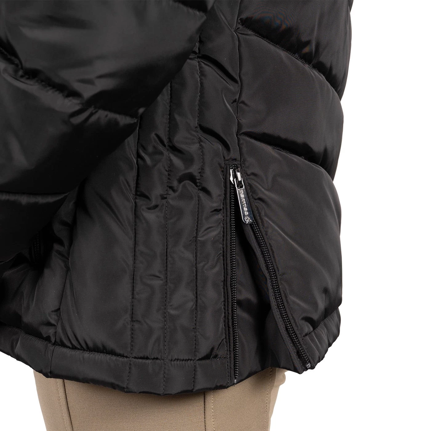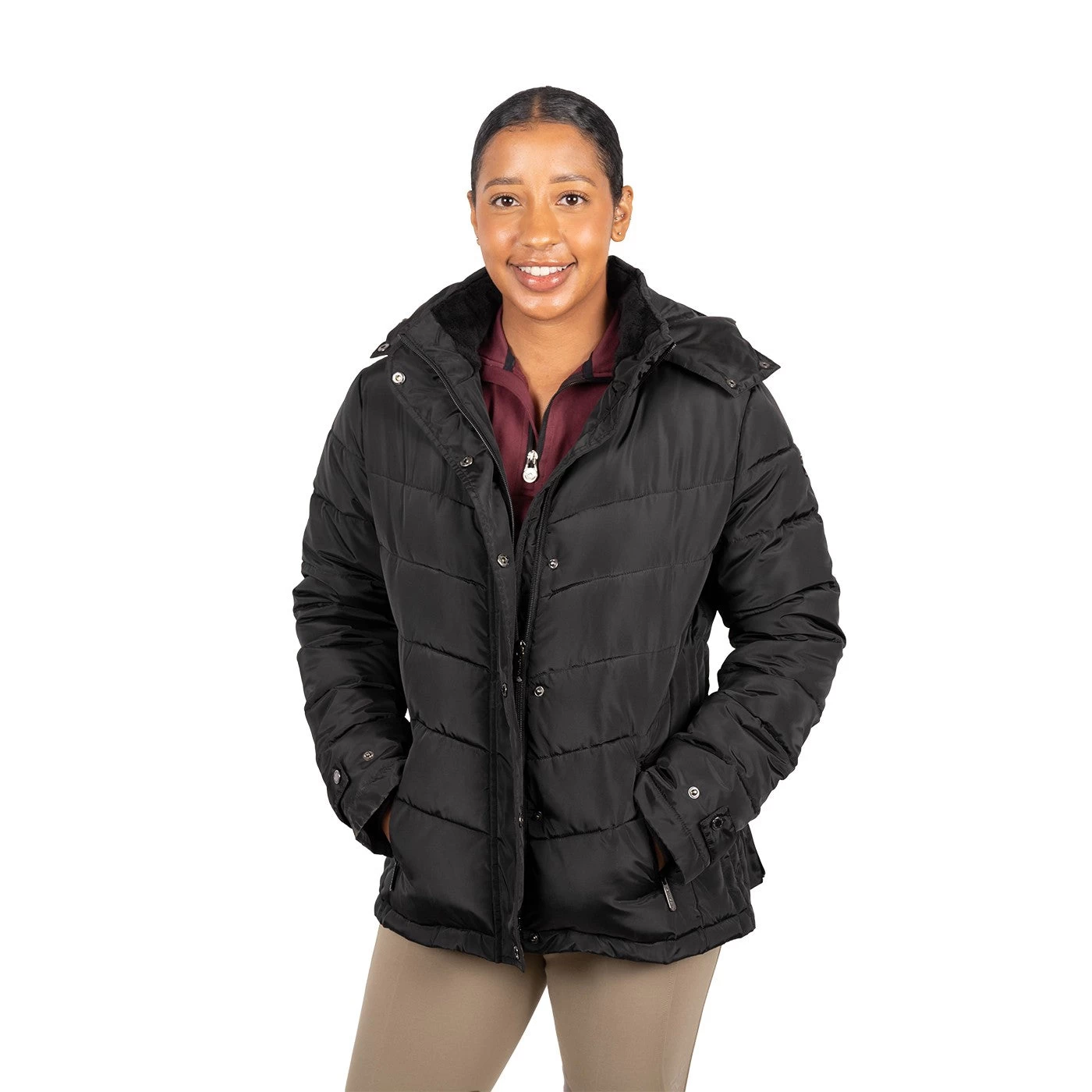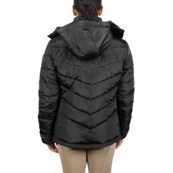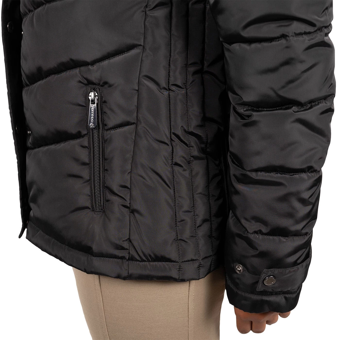 The TemTeq Manitoulin Jacket offers a quilted winter jacket that is suitable for in the saddle or around the barn. Features a luxury, and detachable, faux fur trimmed hood, with knit cuffs for added warmth. Complete with a two-way front zipper, two back vents, silver snaps, and TemTeq’s signature lining and metal badge on the left shoulder.
