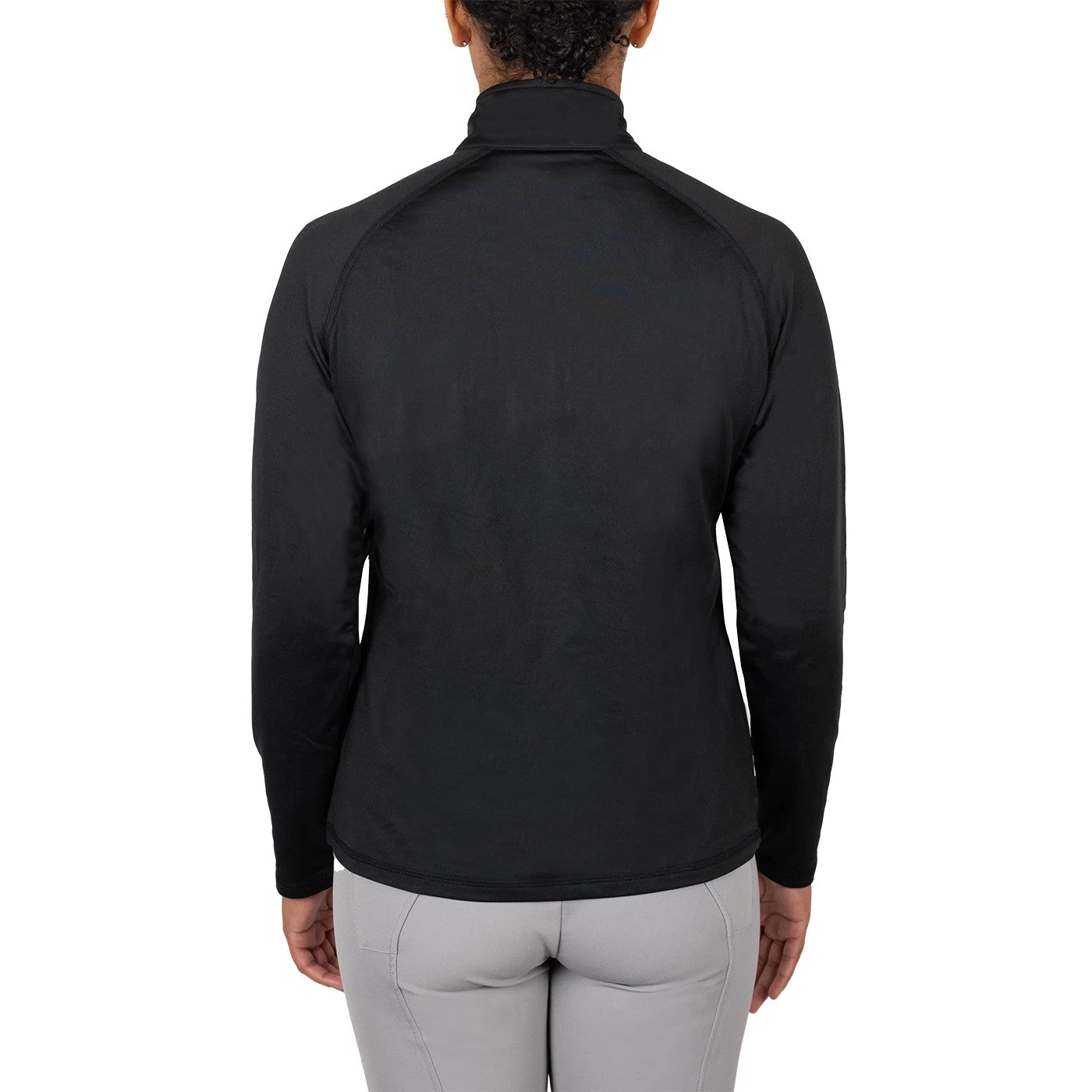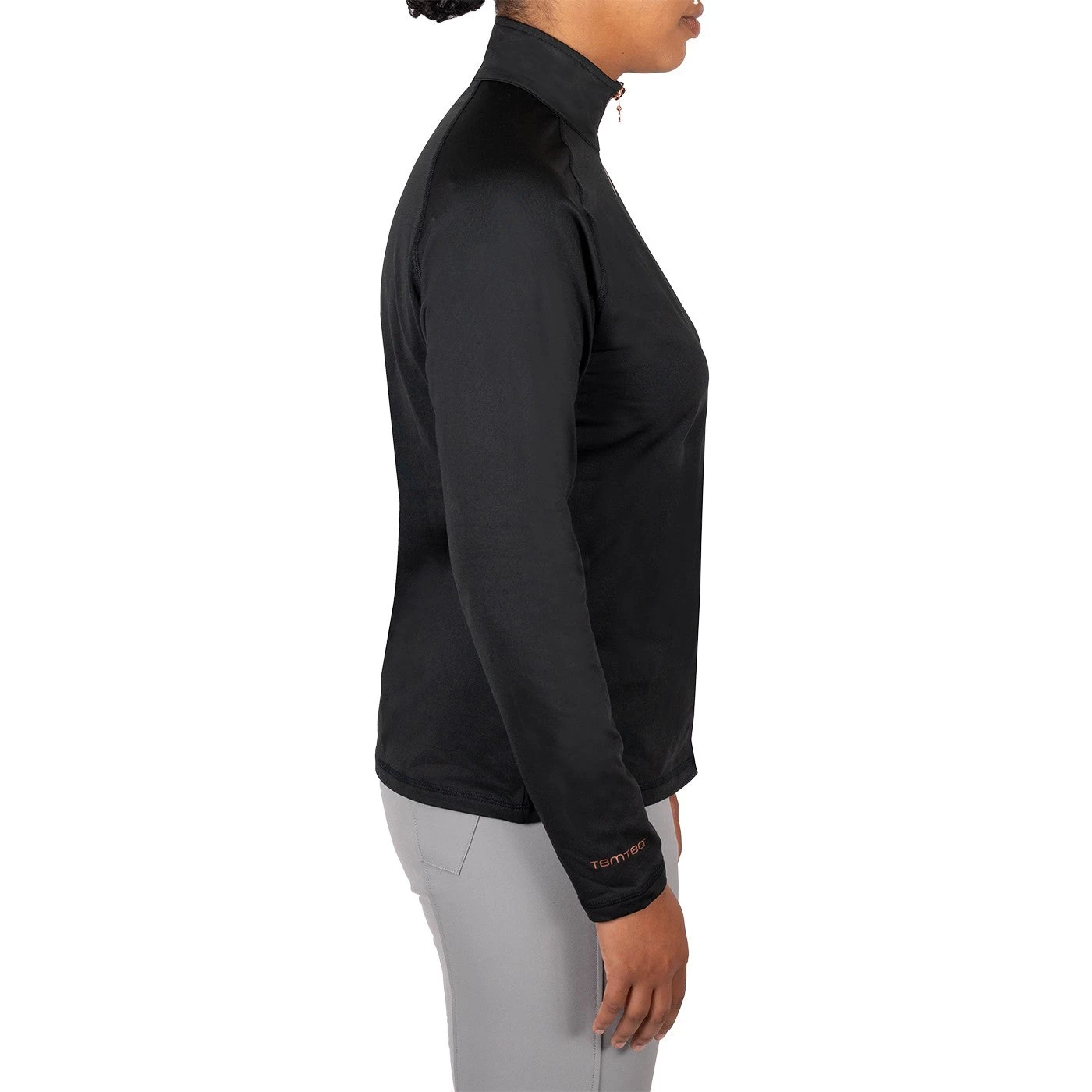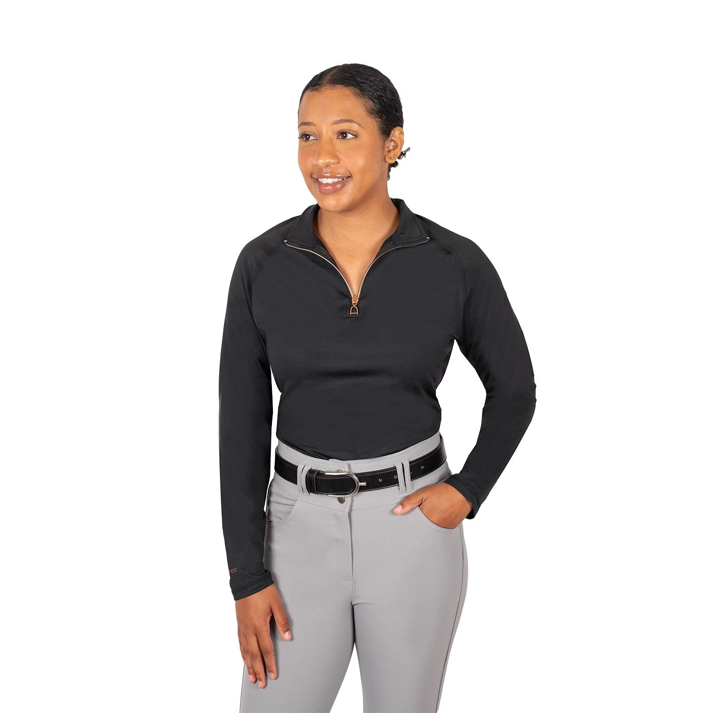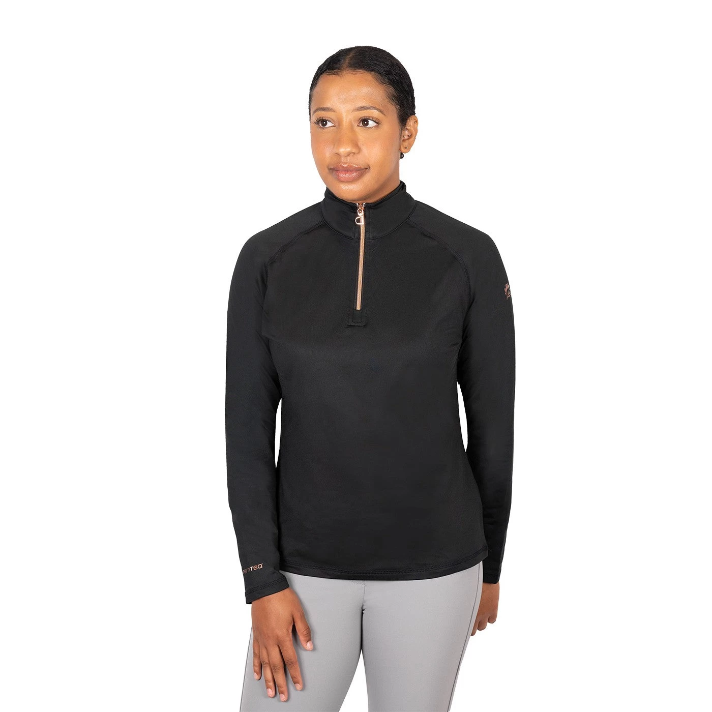 The TemTeq Selena Top is perfect for layering or on its own with its performance stretch outer and fleece lined inner to help keep you comfortable and warm. Features a 1/4 zip front and stirrup shaped zipper pull for added equestrian flare. Complete with the TemTeq logo on the chest.
