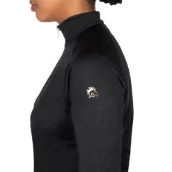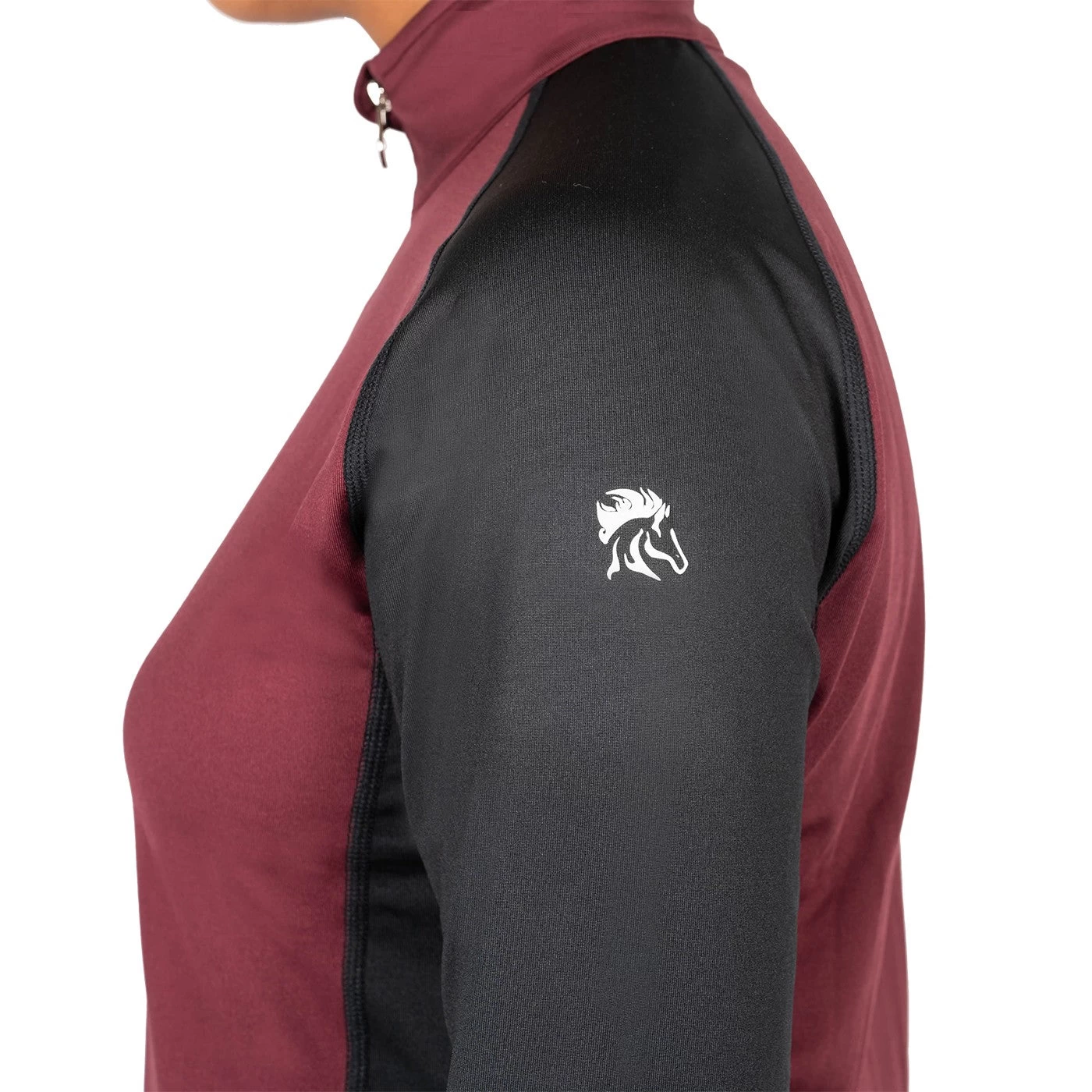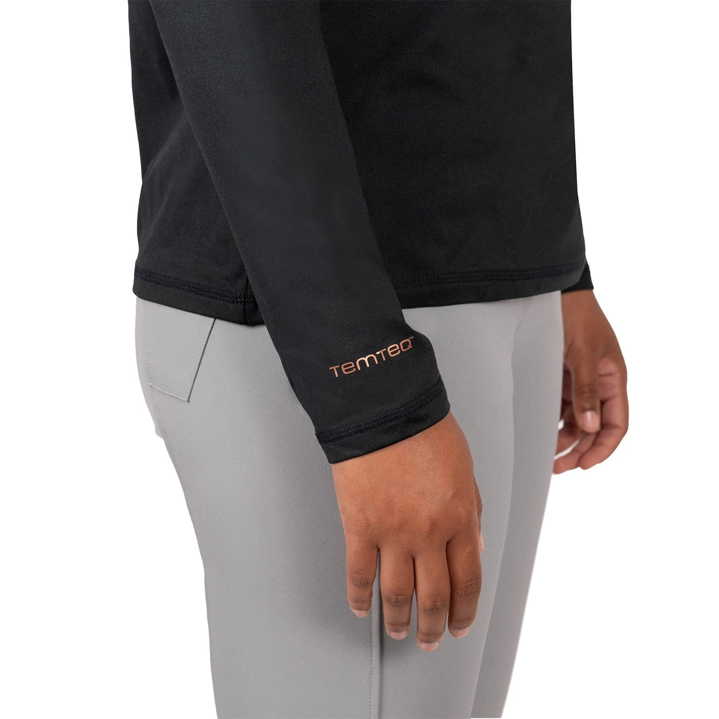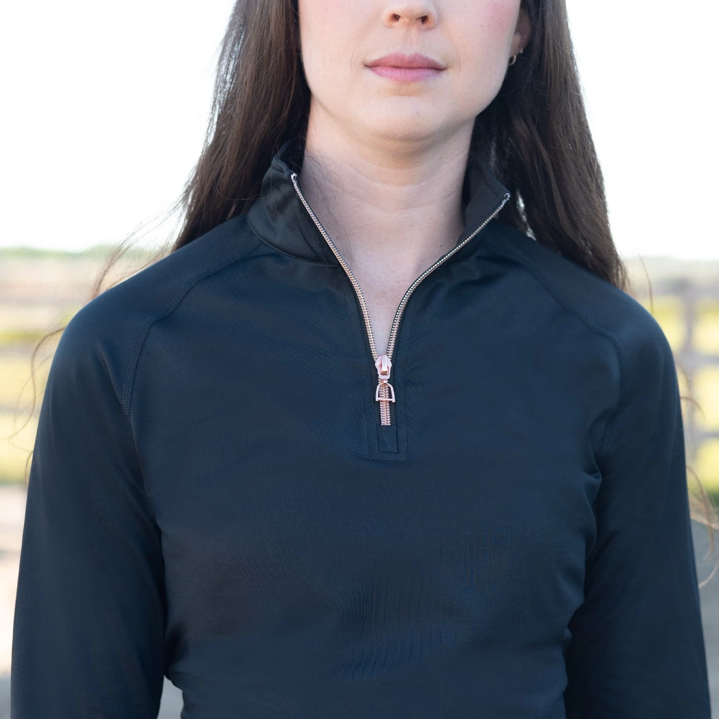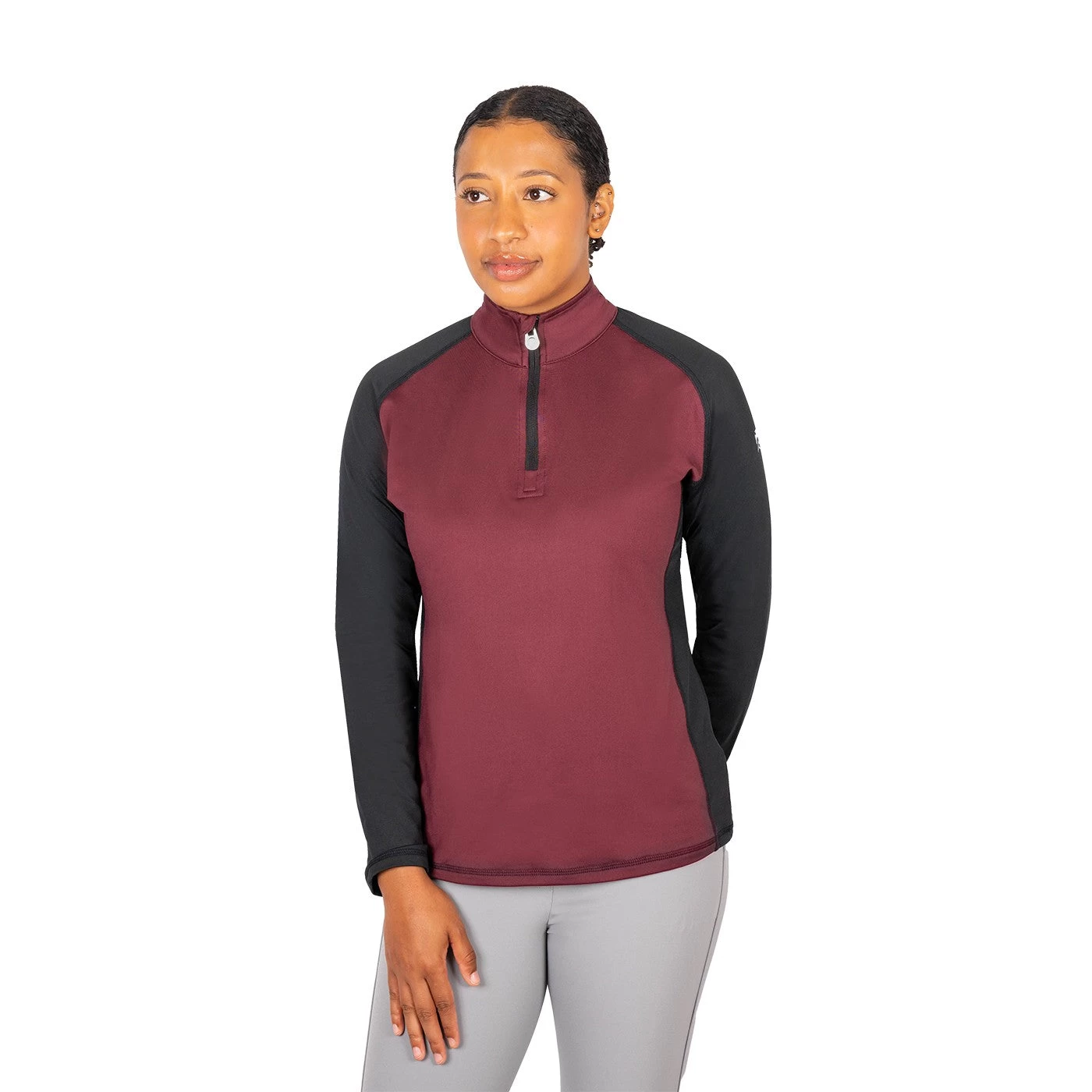The TemTeq Selena Top is perfect for layering or on its own with its performance stretch outer and fleece lined inner to help keep you comfortable and warm. Features a 1/4 zip front and stirrup shaped zipper pull for added equestrian flare. Complete with the TemTeq logo on the chest.