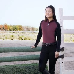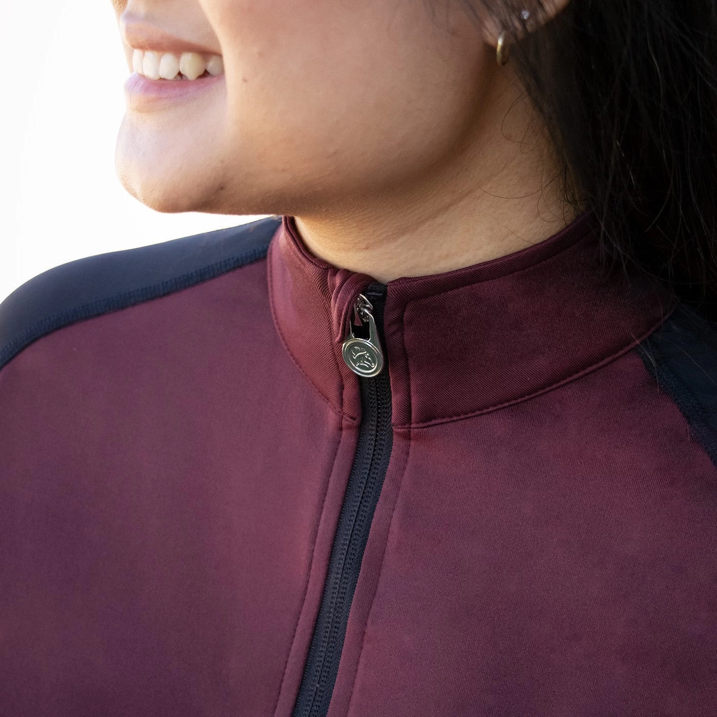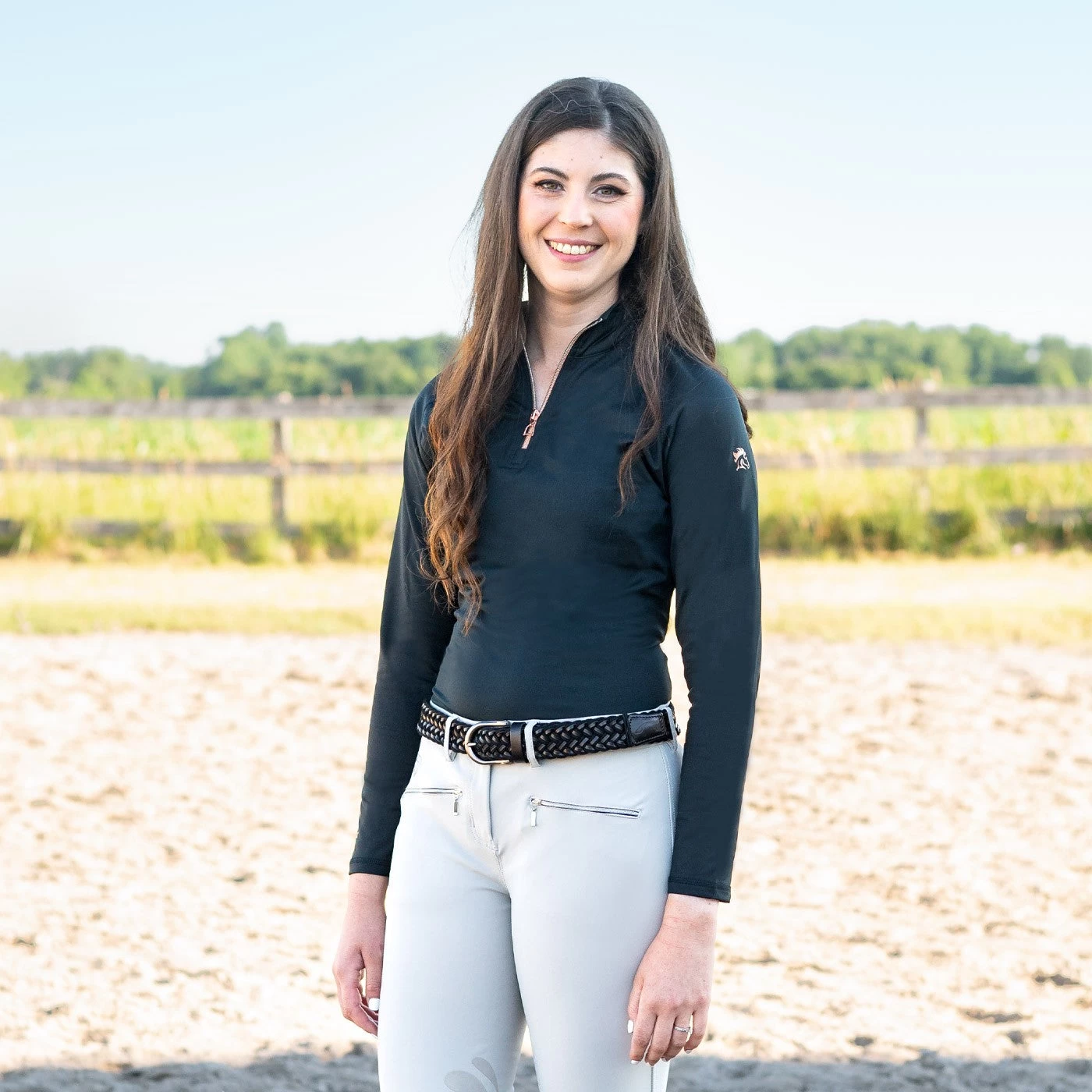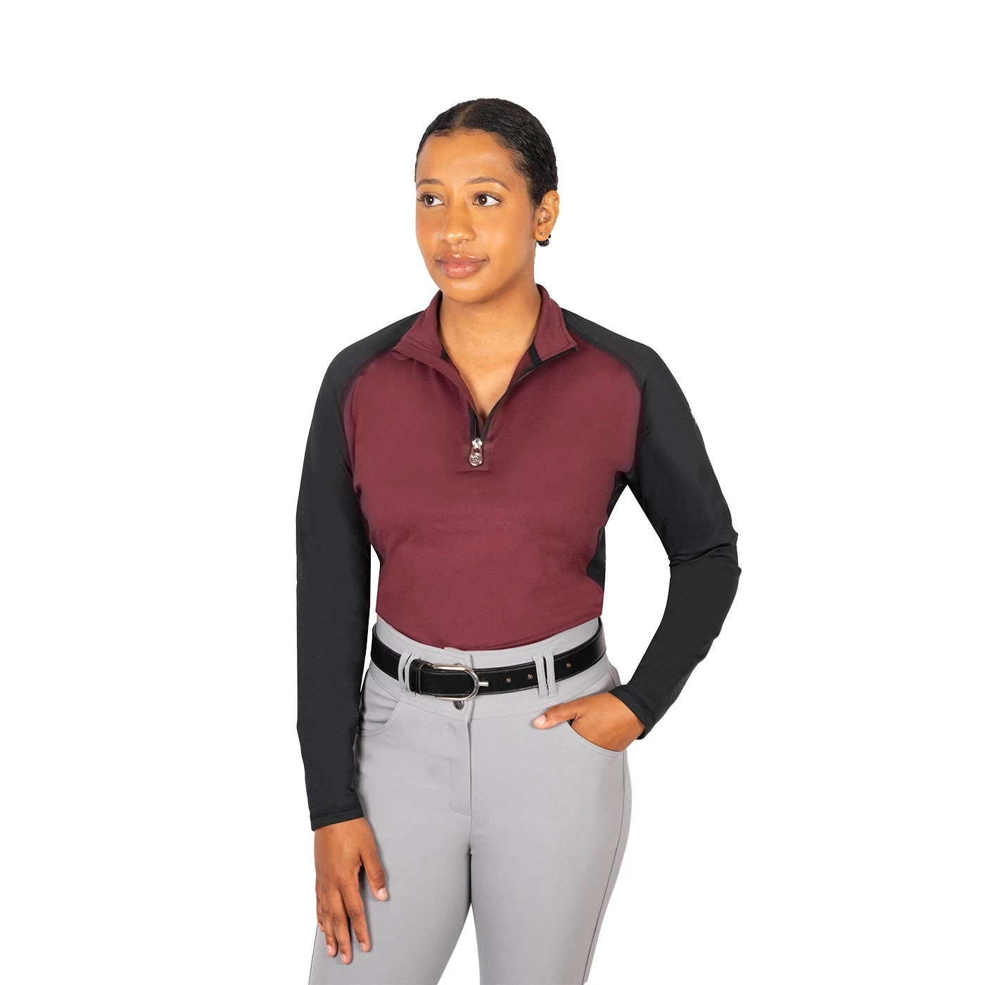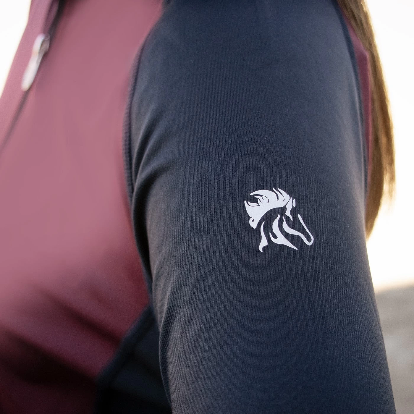The TemTeq Selena Top is perfect for layering or on its own with its performance stretch outer and fleece lined inner to help keep you comfortable and warm. Features a 1/4 zip front and stirrup shaped zipper pull for added equestrian flare. Complete with the TemTeq logo on the chest.