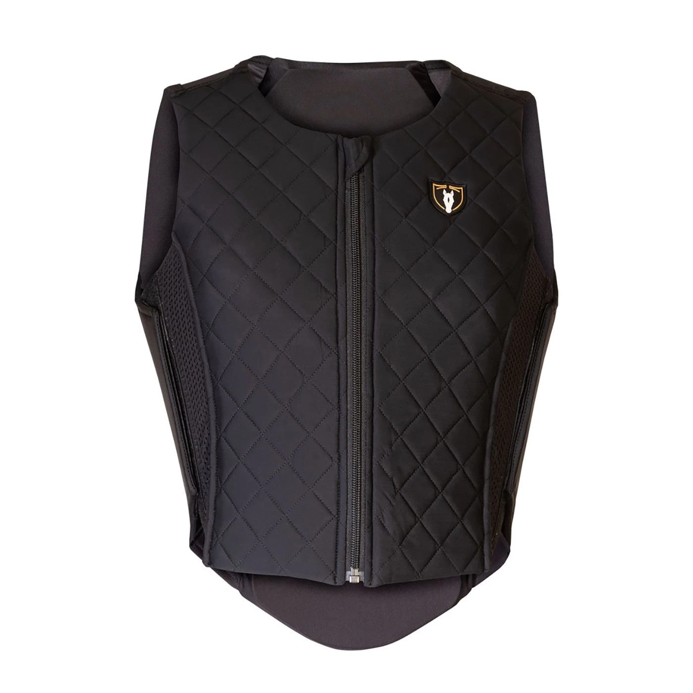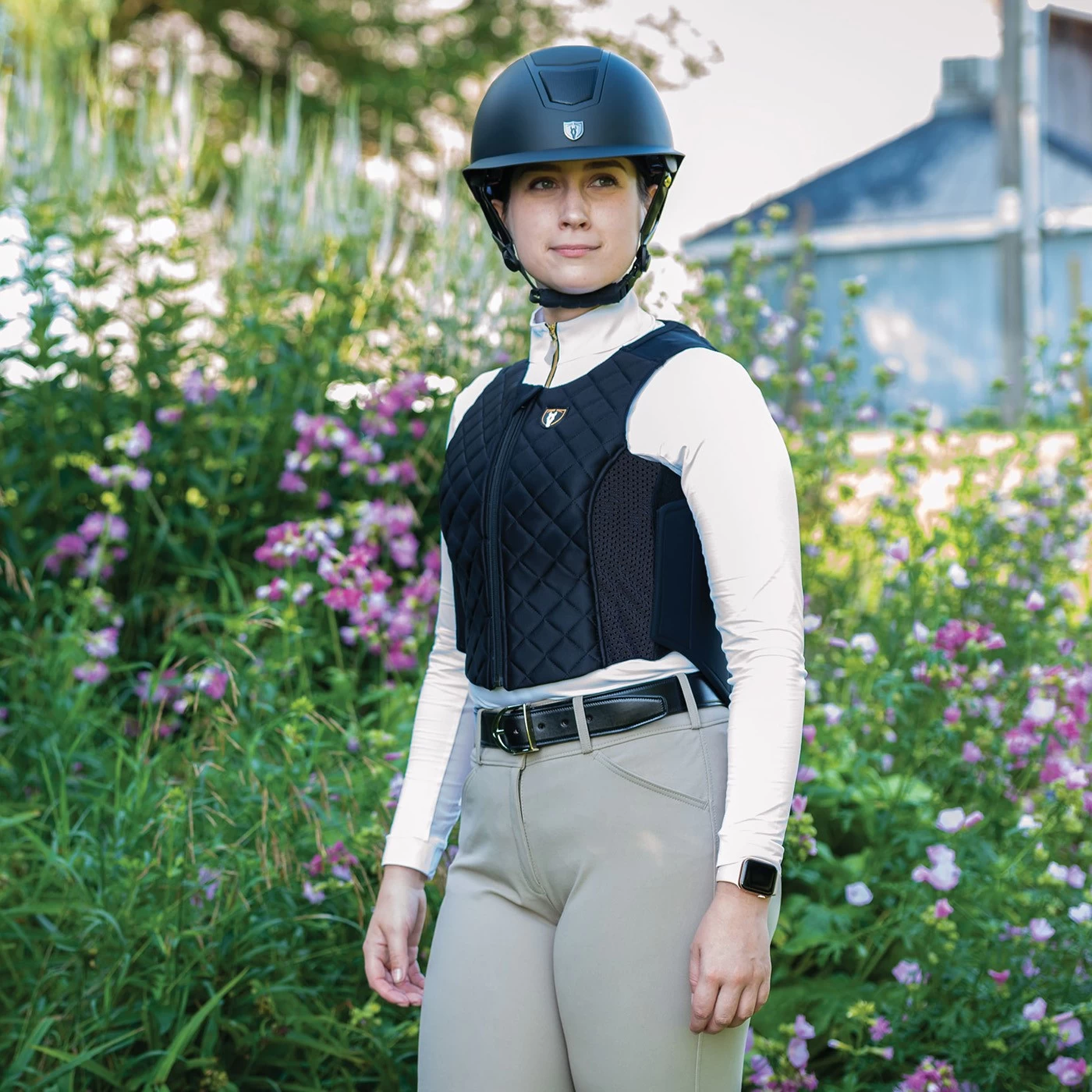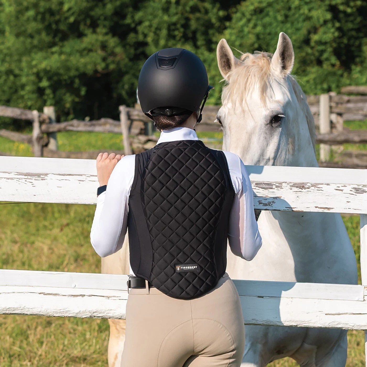 The Tipperary Contour Flex Back Protector provides low profile protection while you’re in the saddle. This breathable, moisture wicking back protector provides maximum comfort and mobility while providing body protection. The traditional quilted styling comes complete with hook and loop size adjustment on both sides and a full length front zipper. Side stretch panels and removable back padding are comfortable and are easy to wipe clean. Back protectors are an excellent choice when riders want some protection, but do not want to add the bulk of a larger vest. An excellent choice for experienced riders who want a mix of protection and mobility, and young riders who don’t want to wear a bulkier vest. Slim enough to fit comfortably below a sweater or jacket. Adult sizes.